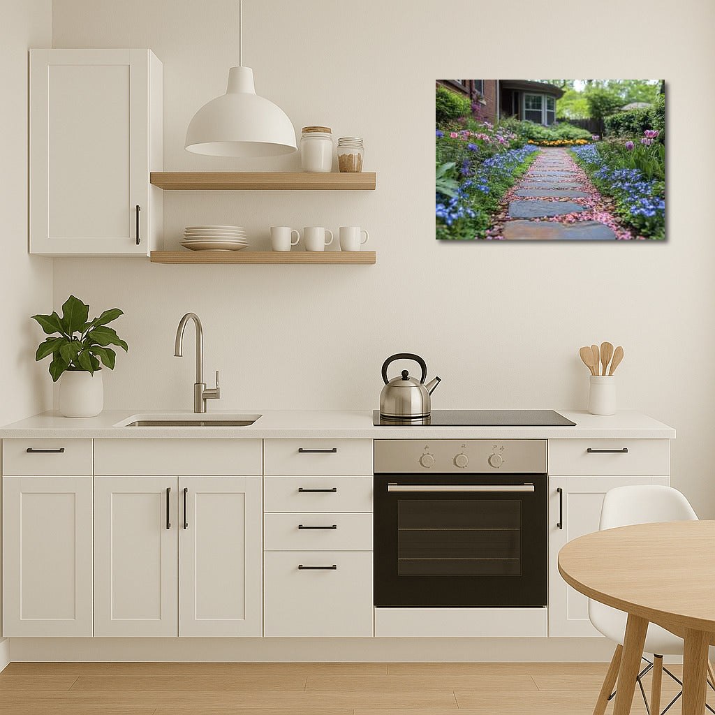 Flower Symphony: Tulips and Forget-me-nots along the Stone Path Wall Art