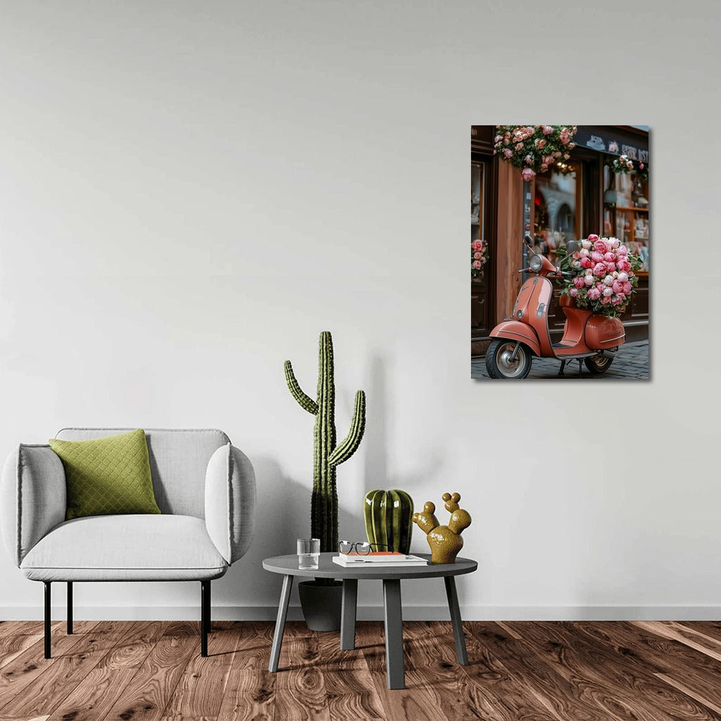 An elegant poster featuring a vintage Vespa scooter decorated with lush flowers. Perfect wall art for romantics! See more from the collection: Mixed Wall Art