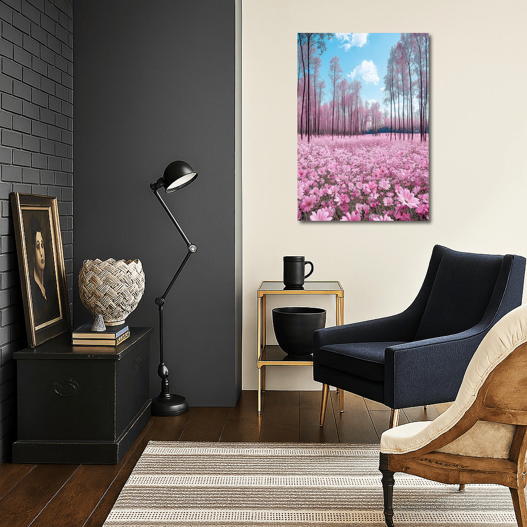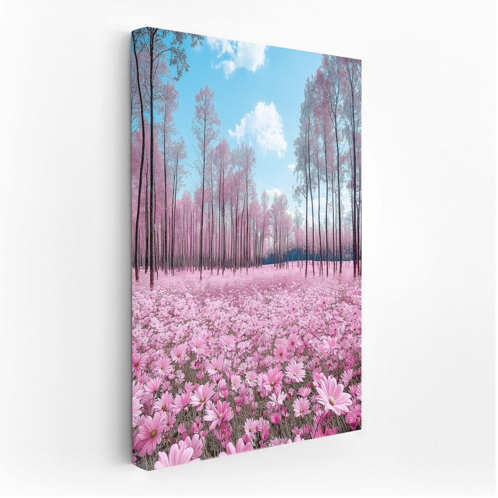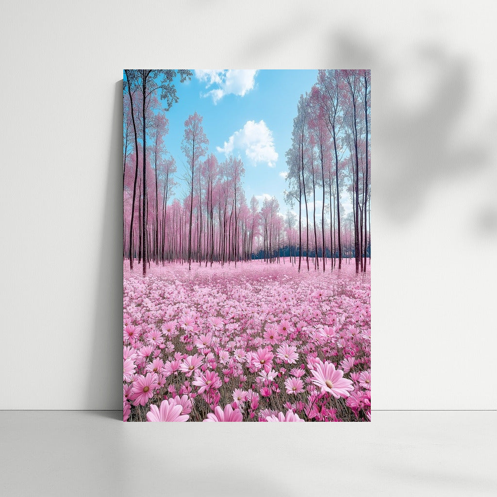 Romance of spring on a poster: a pink field of daisies and delicate trees under a blue sky. Wall art full of harmony. See more from the collection: Pink Flowers Art