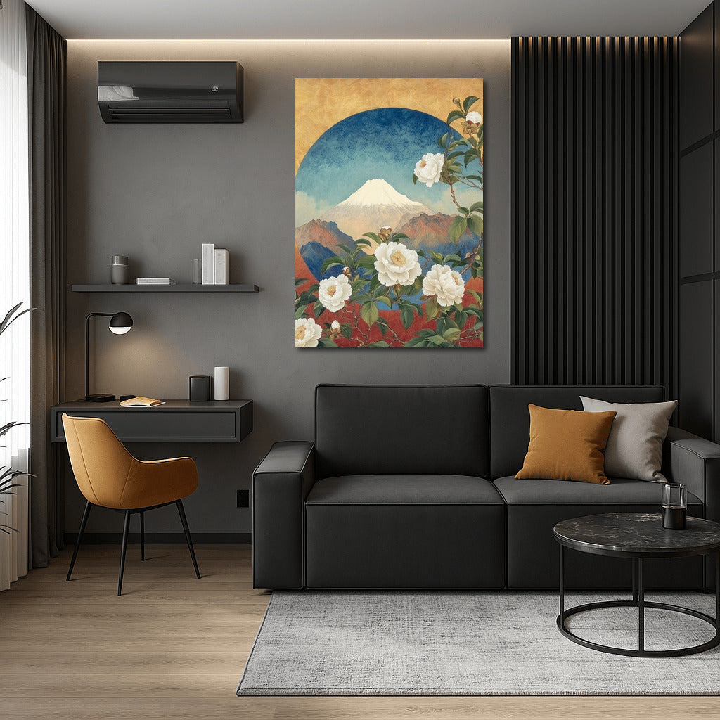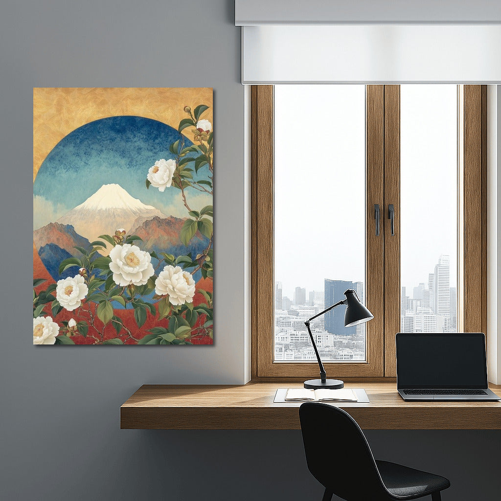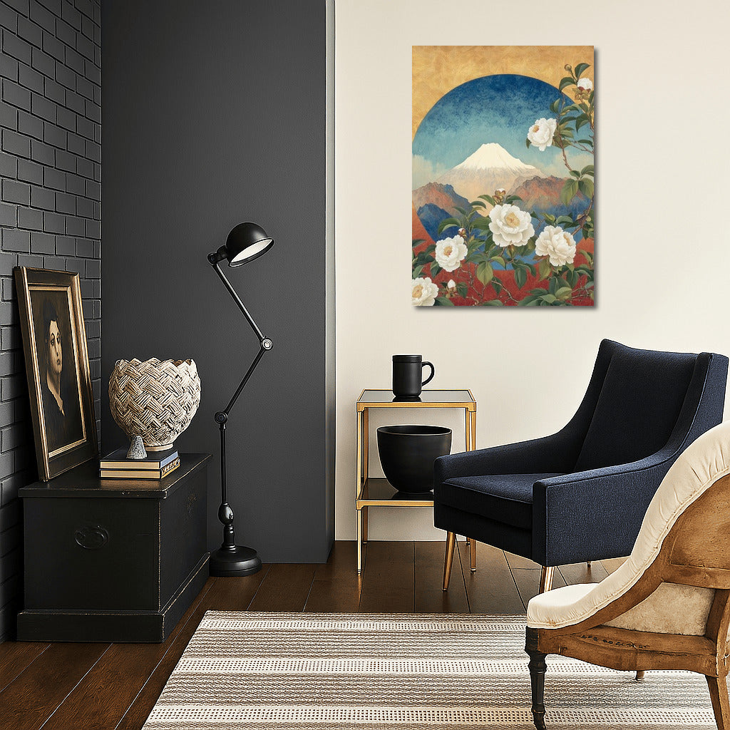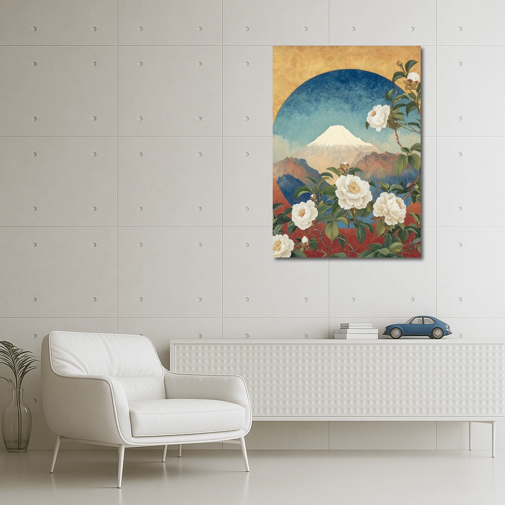 paintingsque painting: white flowers against the backdrop of a majestic mountain, create an atmosphere of harmony. Ideal wall art for home. See more from the collection: Mixed Wall Art