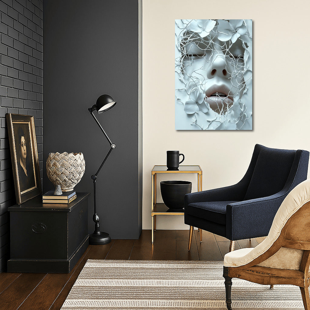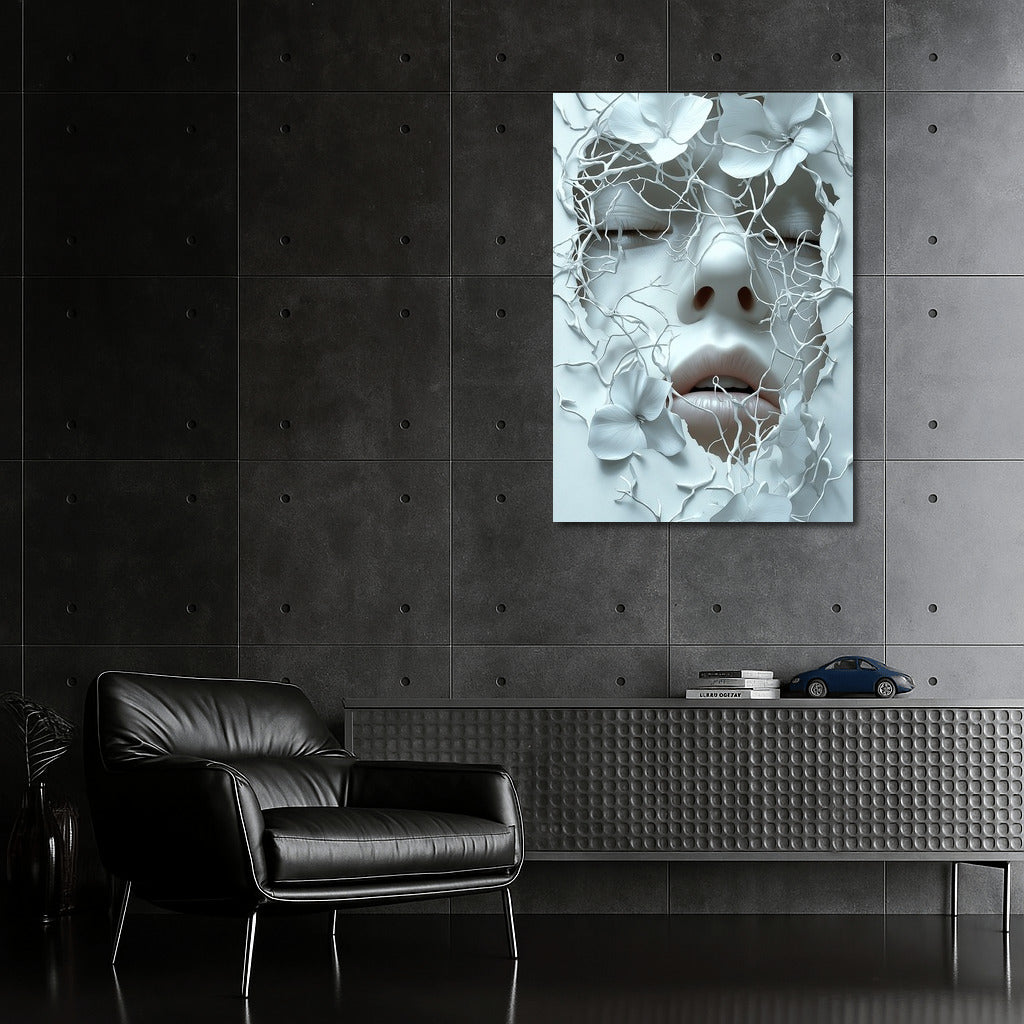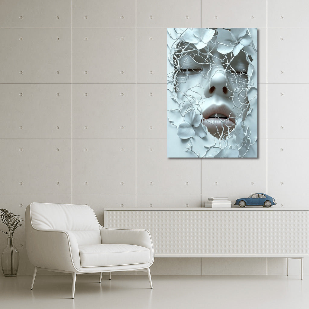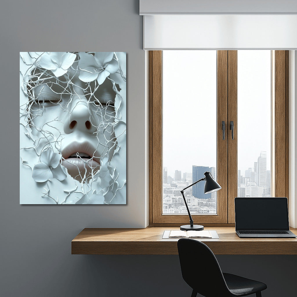 Ephemeral beauty: a poster with a face through which snow-white flowers break through. Wall art for true dreamers. See more from the collection: Mixed Wall Art