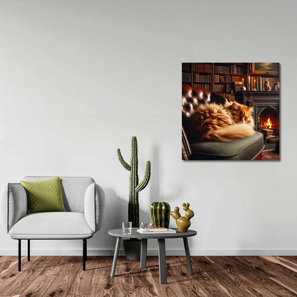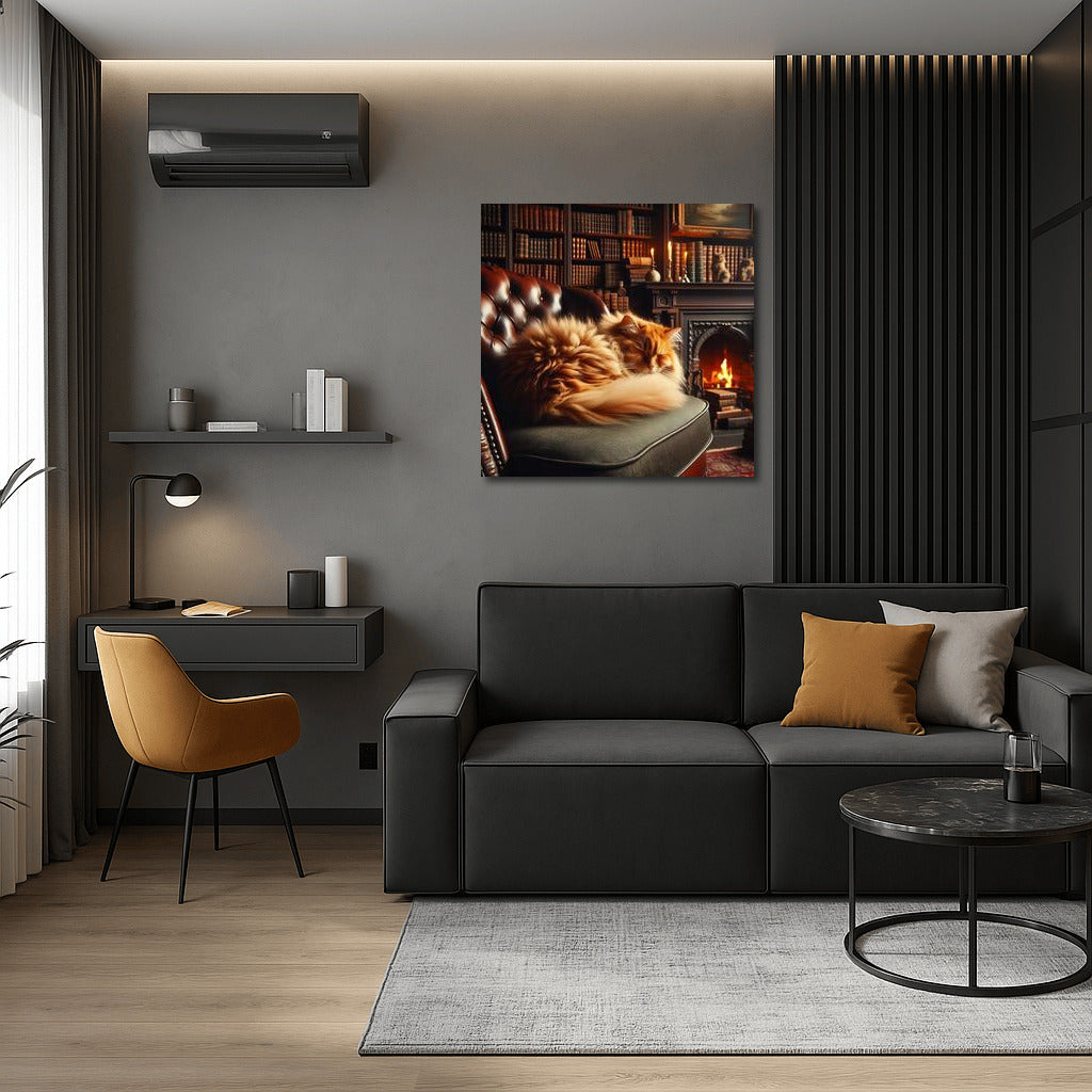 A fluffy cat has made himself comfortable in the library, by the fireplace. A perfect poster to create a warm atmosphere in your home. See more from the collection: Animals Art
