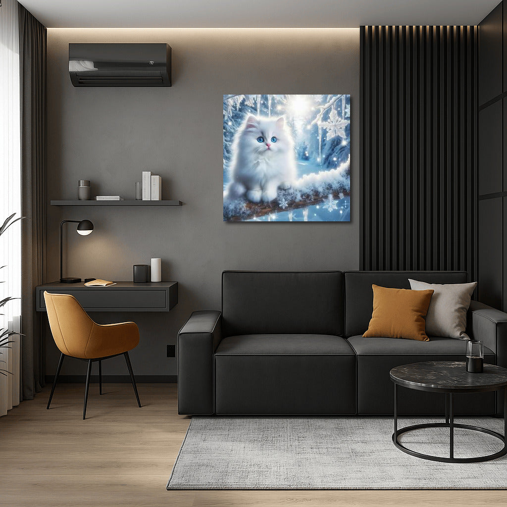 Fluffy cat in a snowy fairy tale: charming wall art for a cozy home. Let winter inspire you! See more from the collection: Animals Art