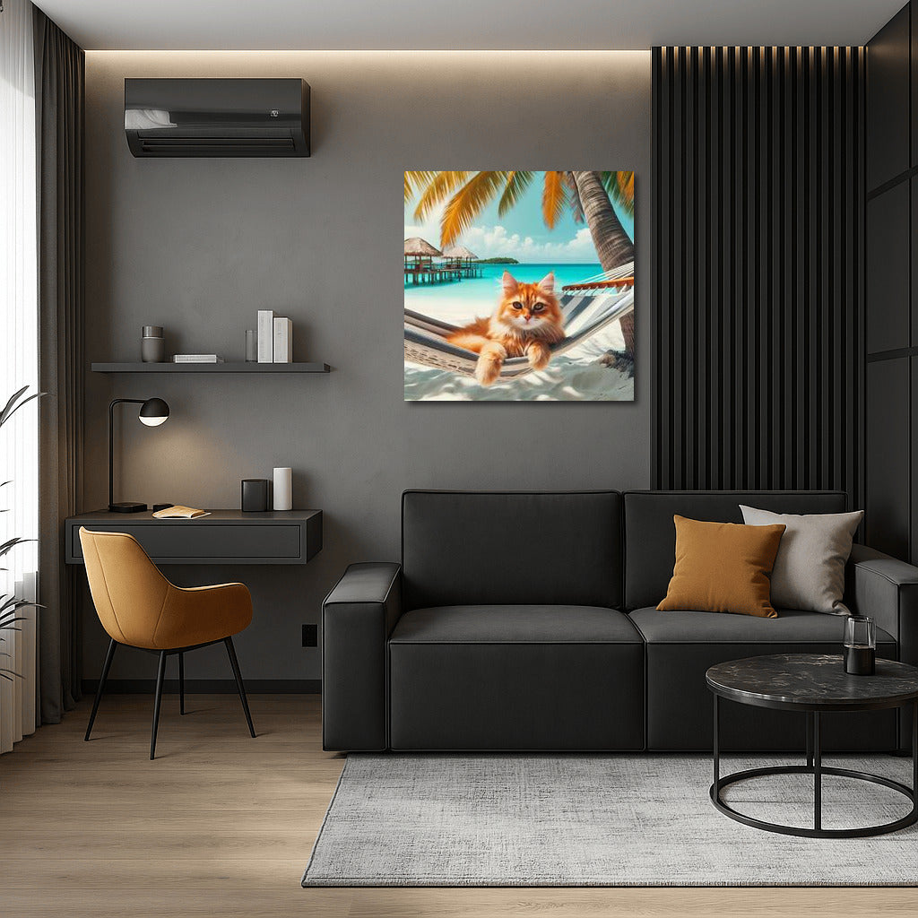 Cat in tropical paradise! A poster of a furry cat relaxing on the beach under palm trees is the perfect wall art for relaxation. See more from the collection: Animals Art