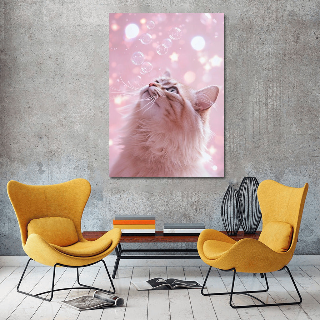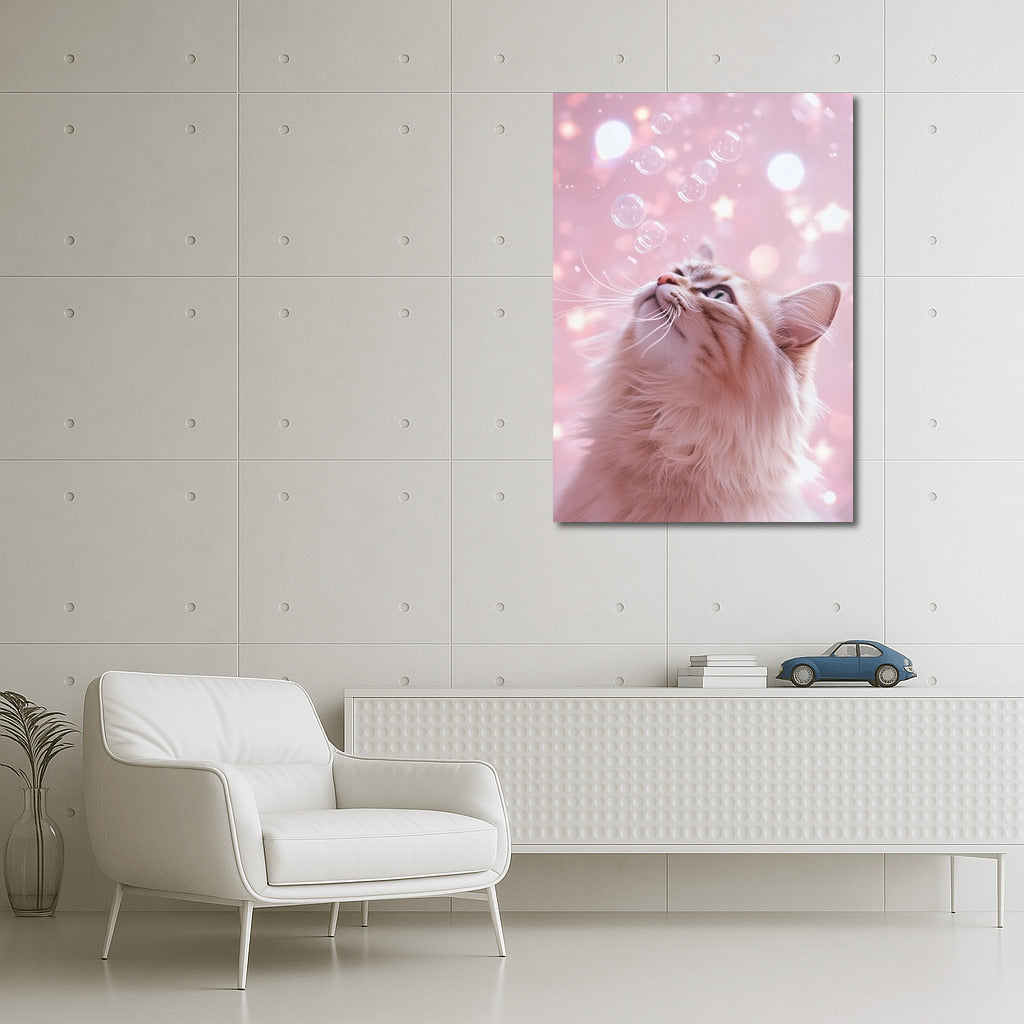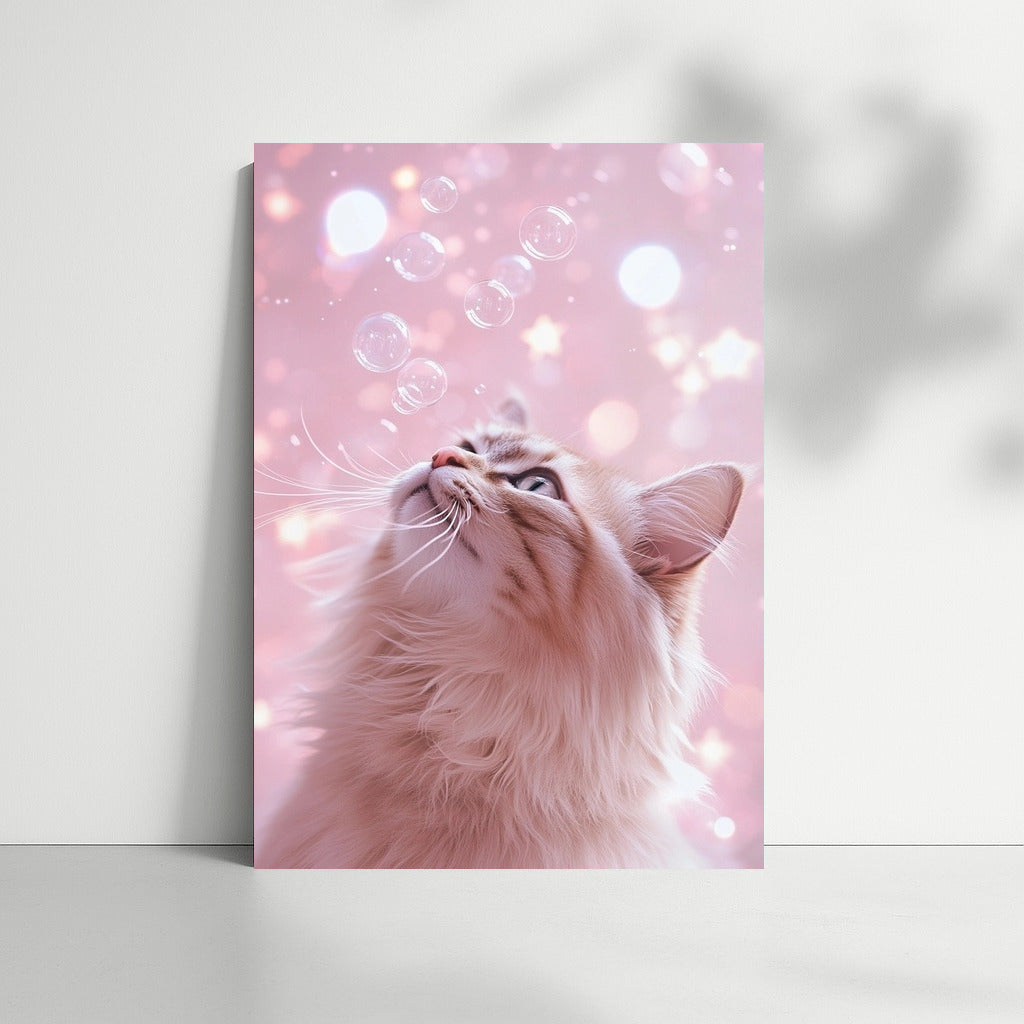 A cute fluffy cat watches bubbles on a soft pink background. This poster will add magic to your wall art! ✨ See more from the collection: Animals Art