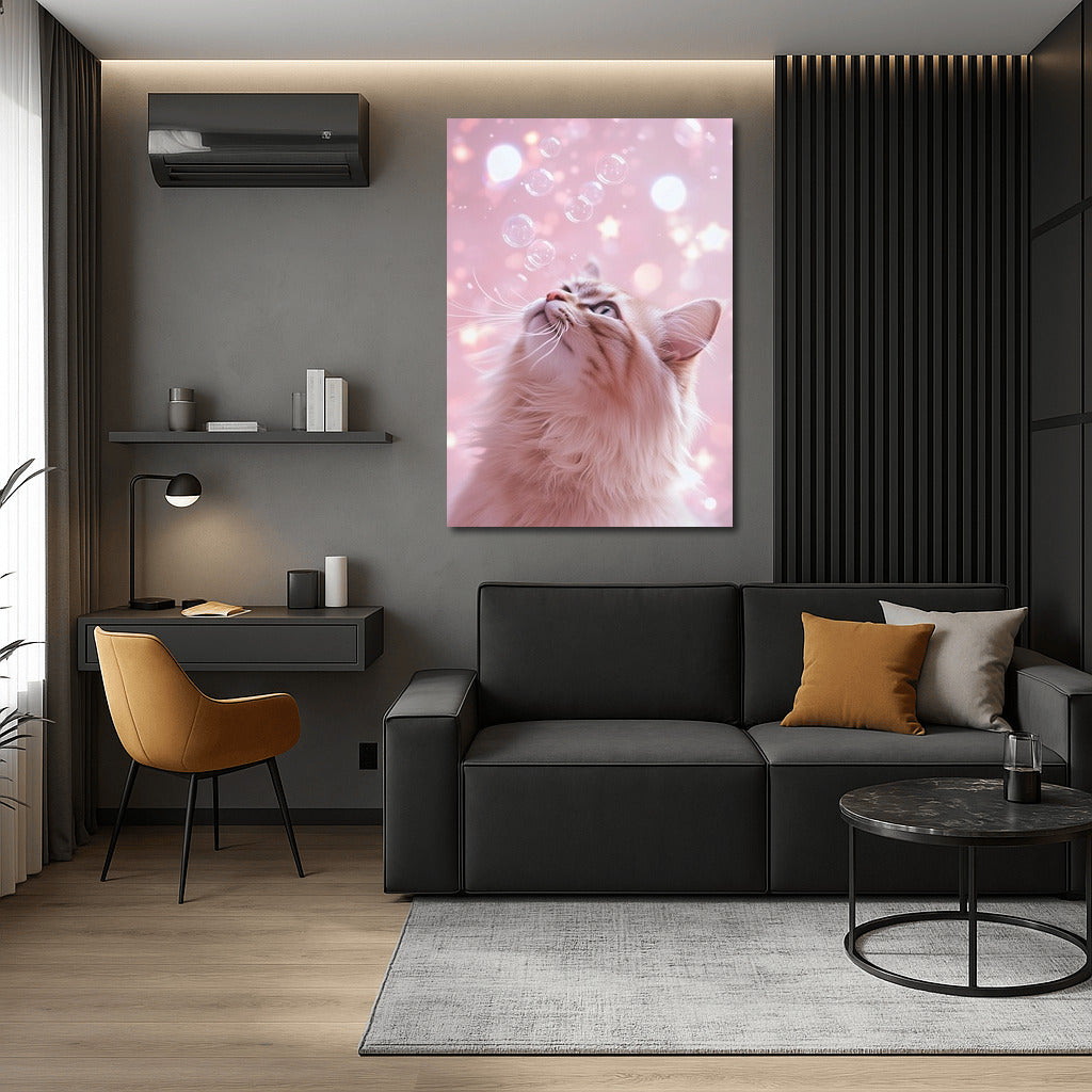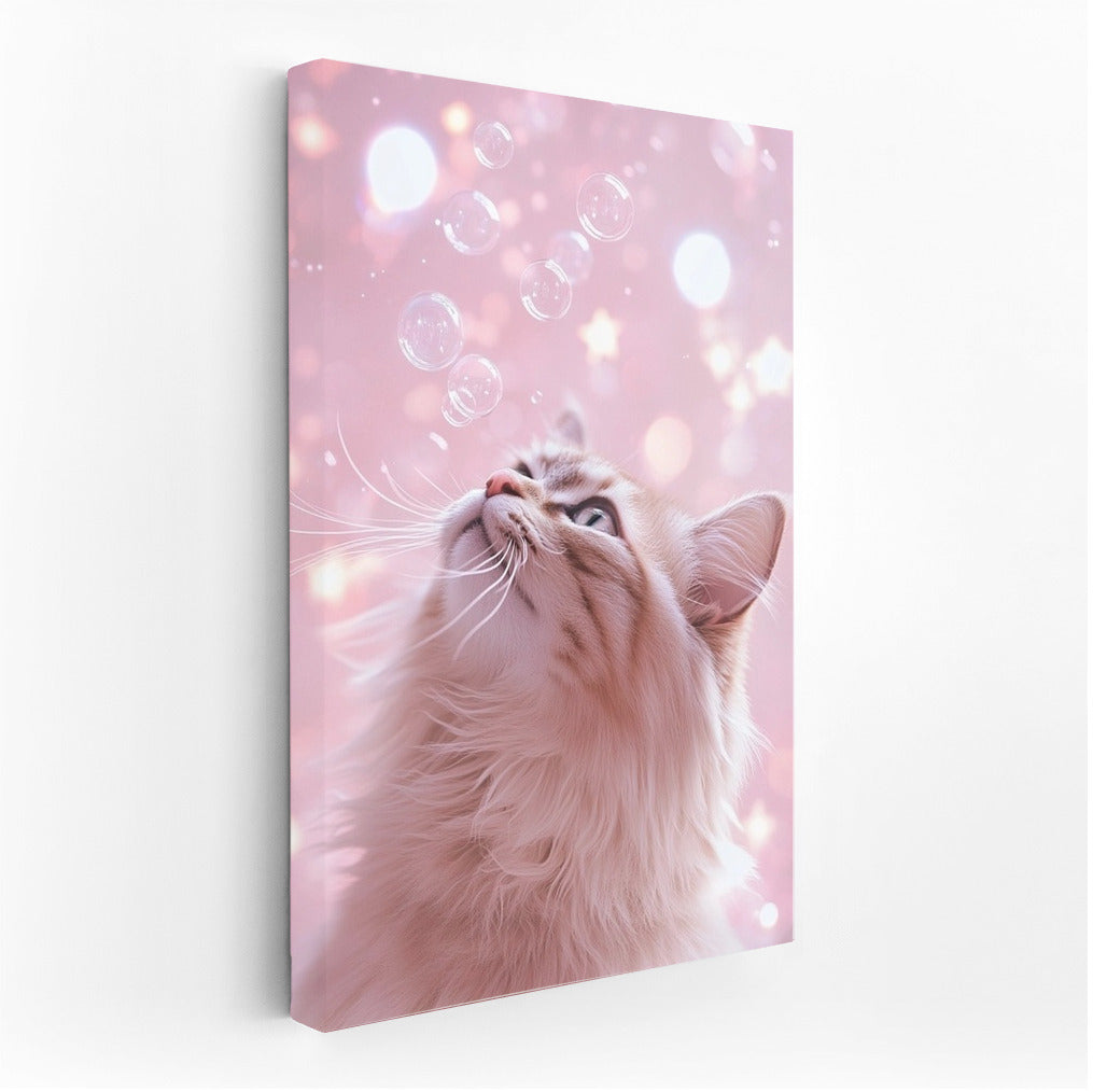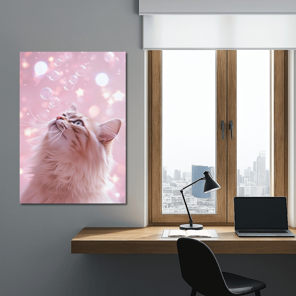 A cute fluffy cat watches bubbles on a soft pink background. This poster will add magic to your wall art! ✨ See more from the collection: Animals Art