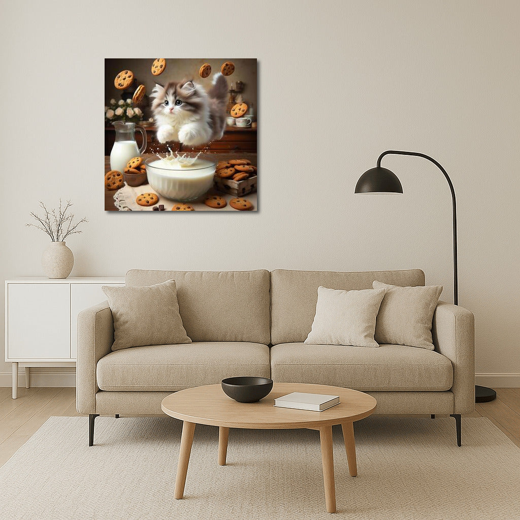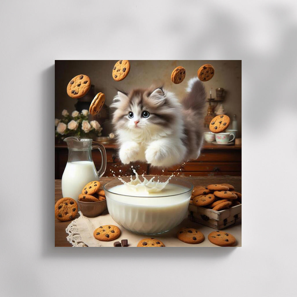 A fluffy Ragdoll diving into milk, surrounded by flying cookies. The perfect poster for cat lovers and a cozy mood! See more from the collection: Animals Art