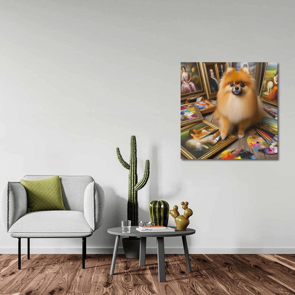 The highlight of your wall is a painting of a fluffy Spitz, who brings art to life by jumping from one masterpiece to another! See more from the collection: Animals Art