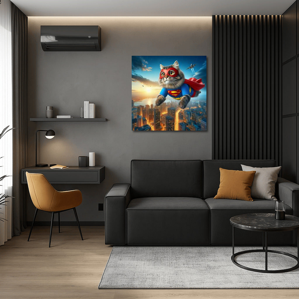 This poster brings to life a superhero cat soaring above the city, ready to save the world! Wall art in action! See more from the collection: Animals Art