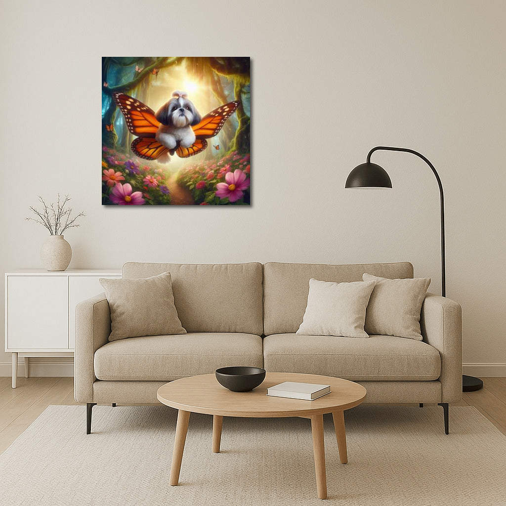 Shih Tzu on Butterfly Wings Poster: Magic in the forest where the dog flies among giant flowers. Dream wall art! See more from the collection: Animals Art