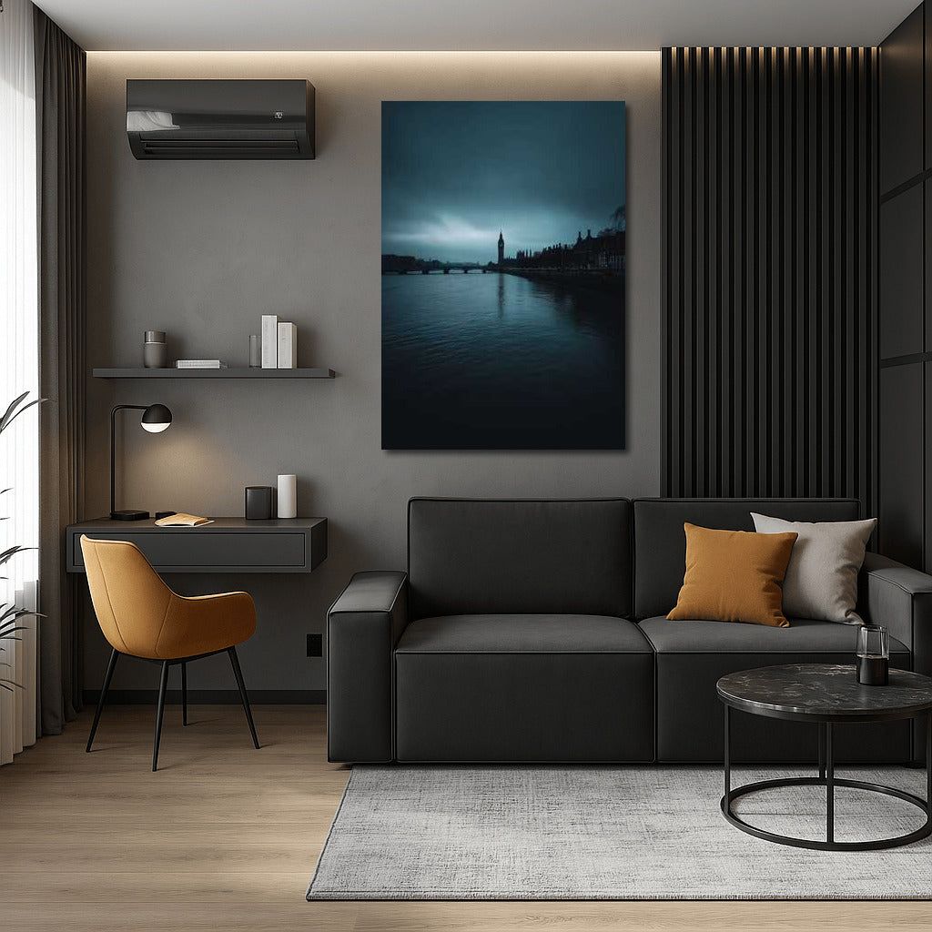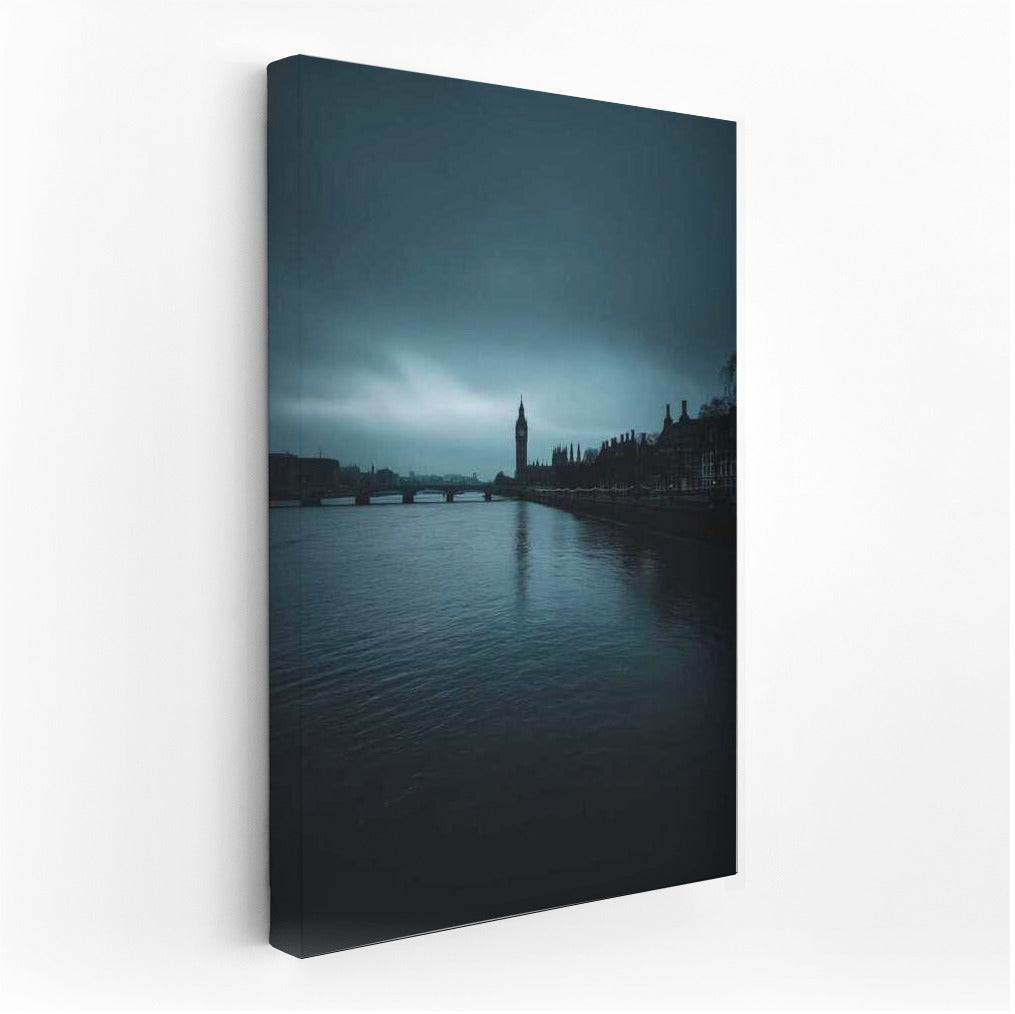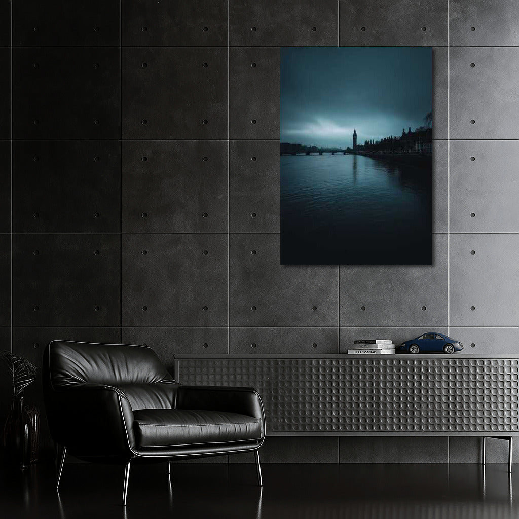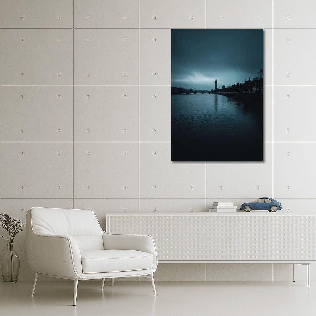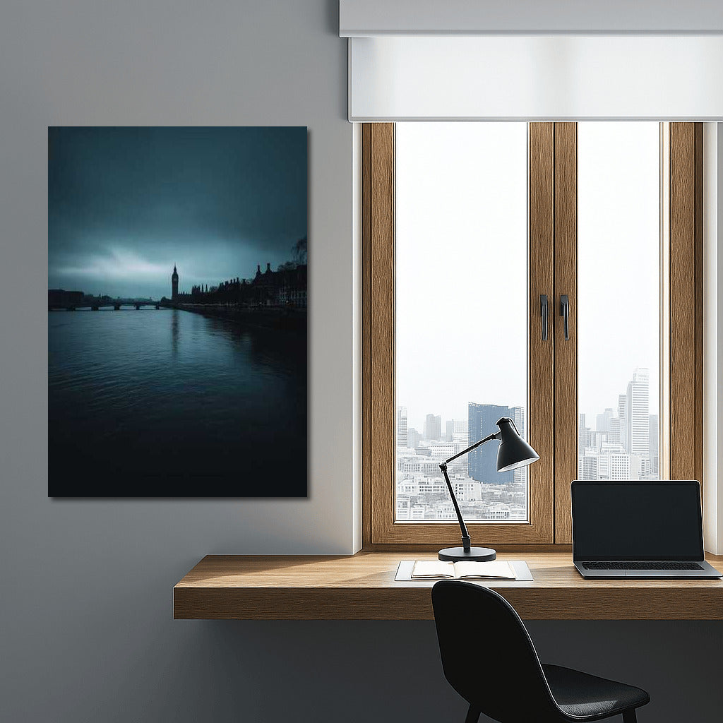 Foggy London wakes up on a poster: the majestic silhouette of Big Ben and the quiet waters of the Thames. Wall art of Great Britain. See more from the collection: Country Art