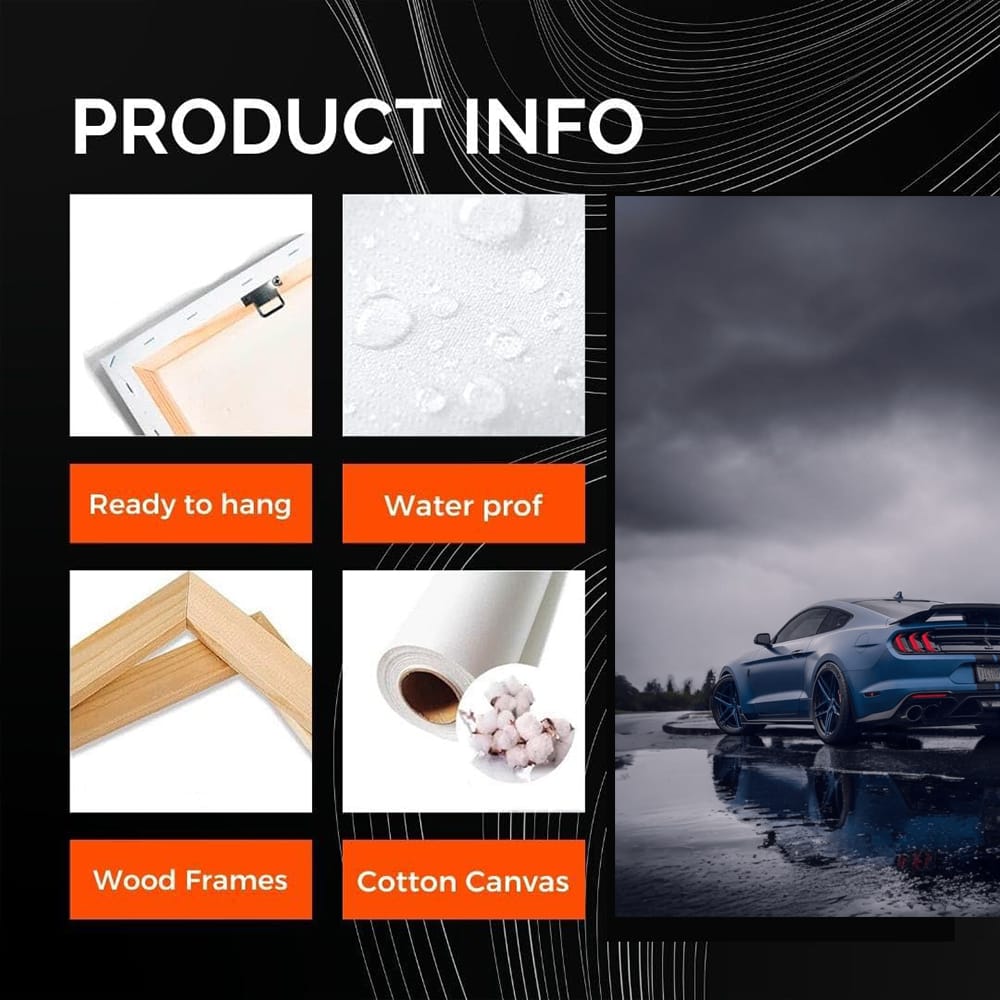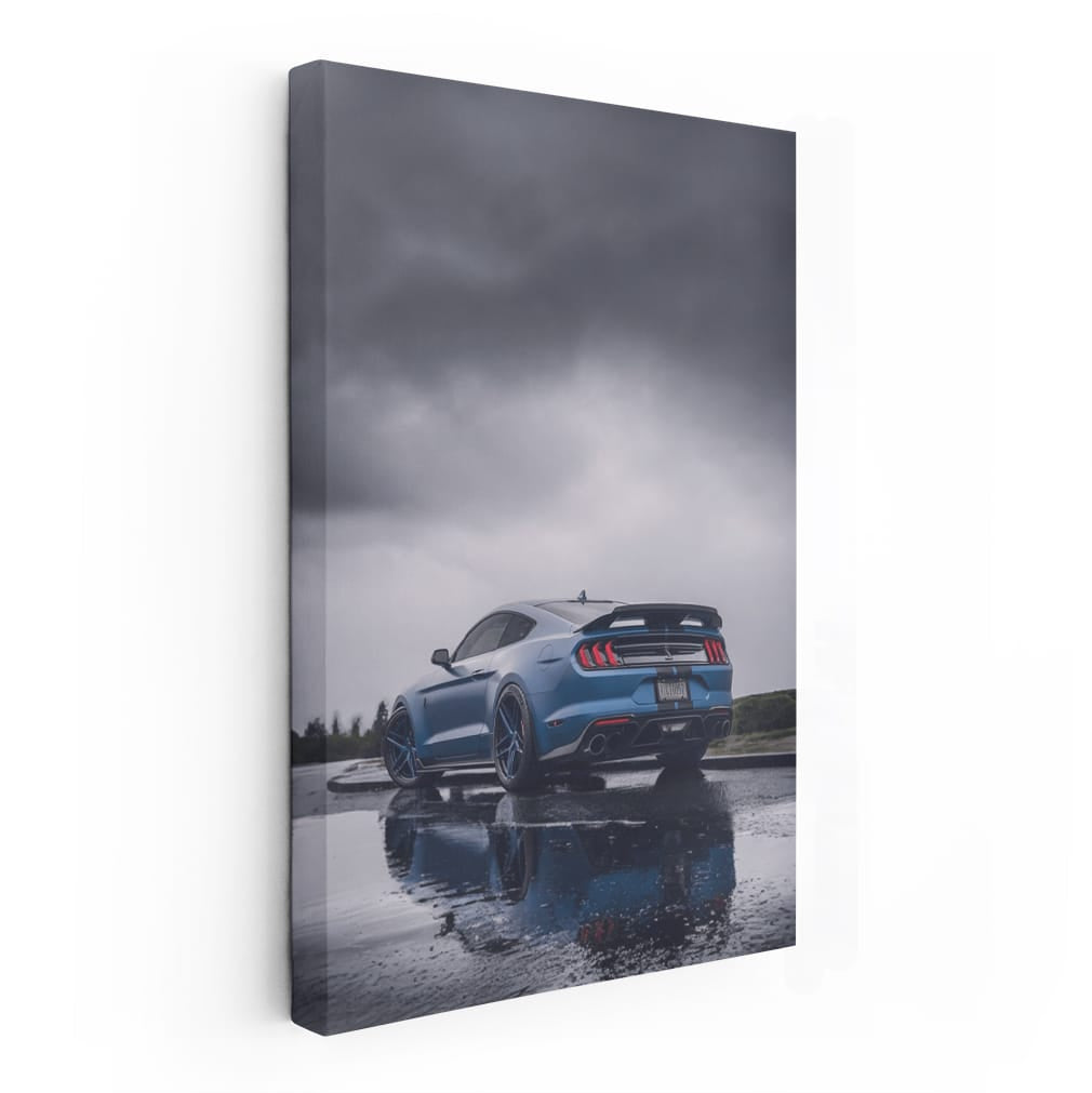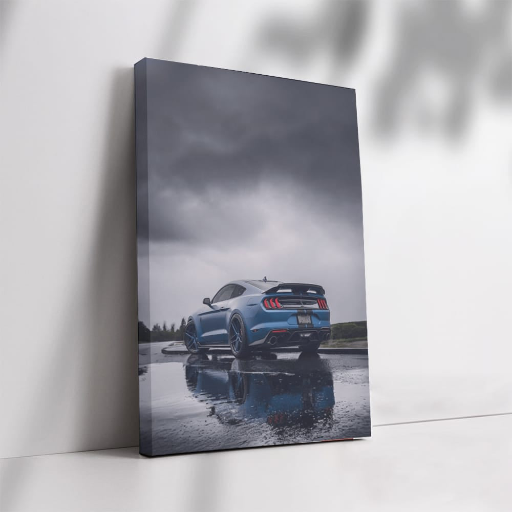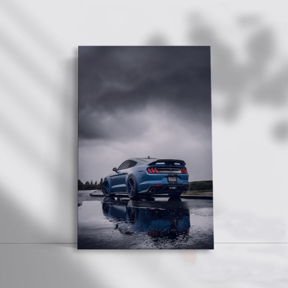 In the poster "Mustang in the fog" the car seems to be made to break into the city at night. This piece of wall art is pure adrenaline. The painting shows the Mustang as an animal ready to break loose. This is not just a car, but a symbol of freedom and speed. See more from the collection: Ford Art
