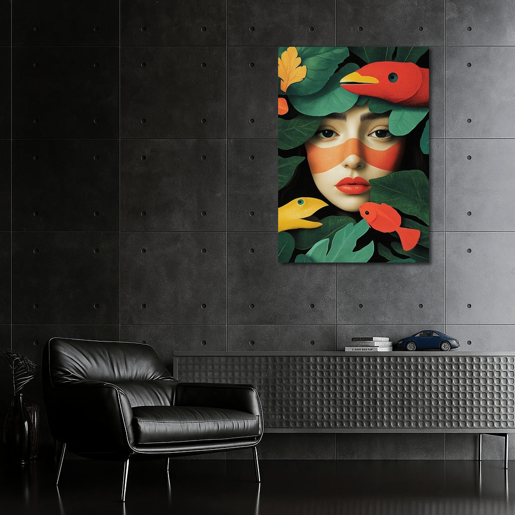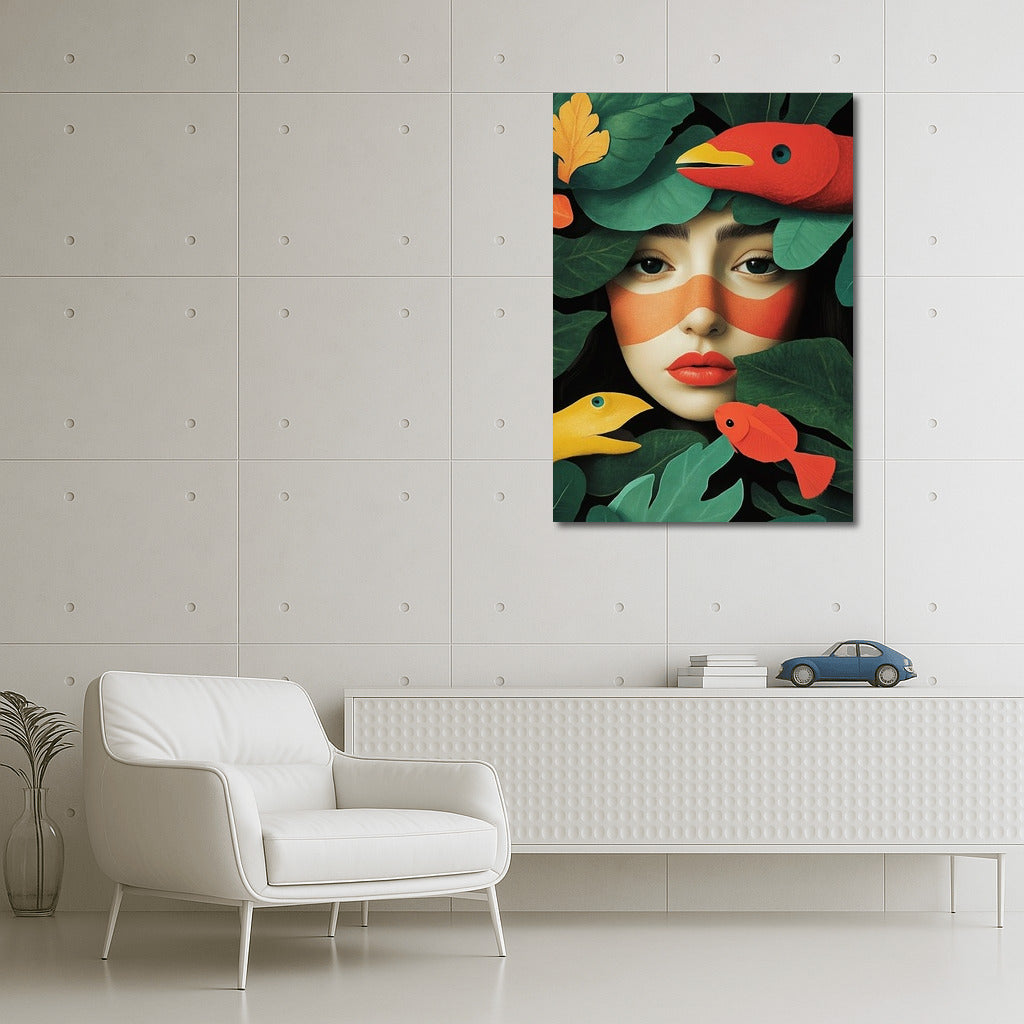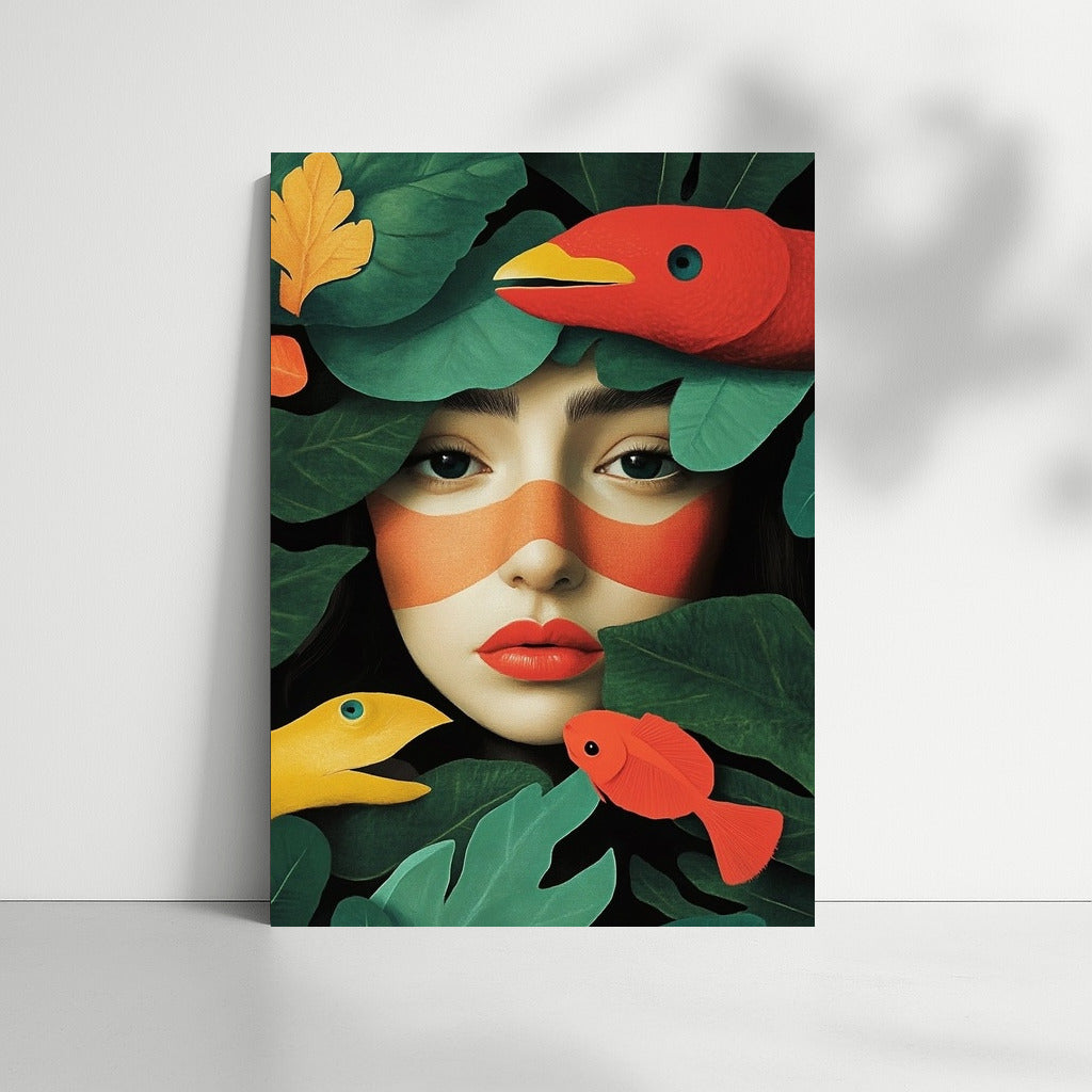 Magical poster: face framed by colorful leaves and fish. Wall art for those who seek harmony of color and form. See more from the collection: Mixed Wall Art