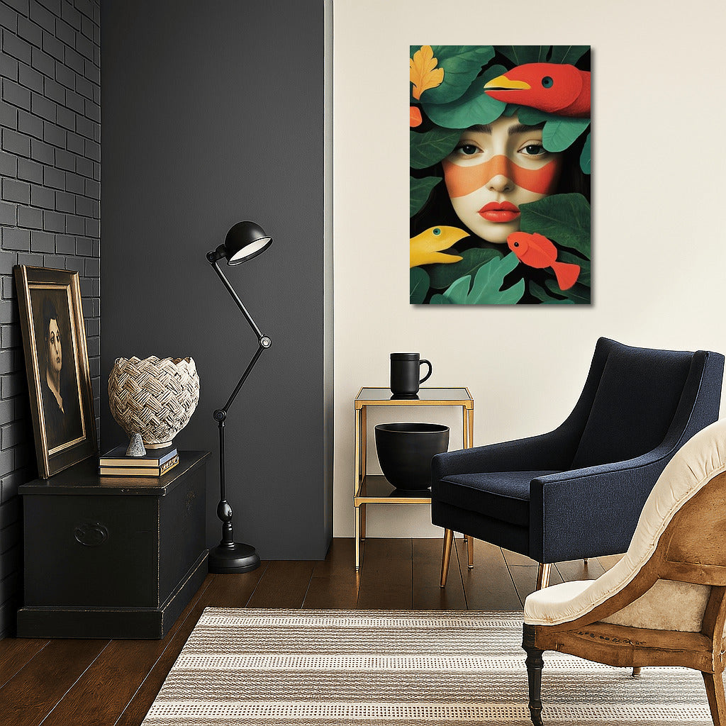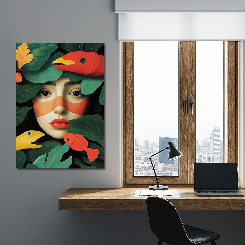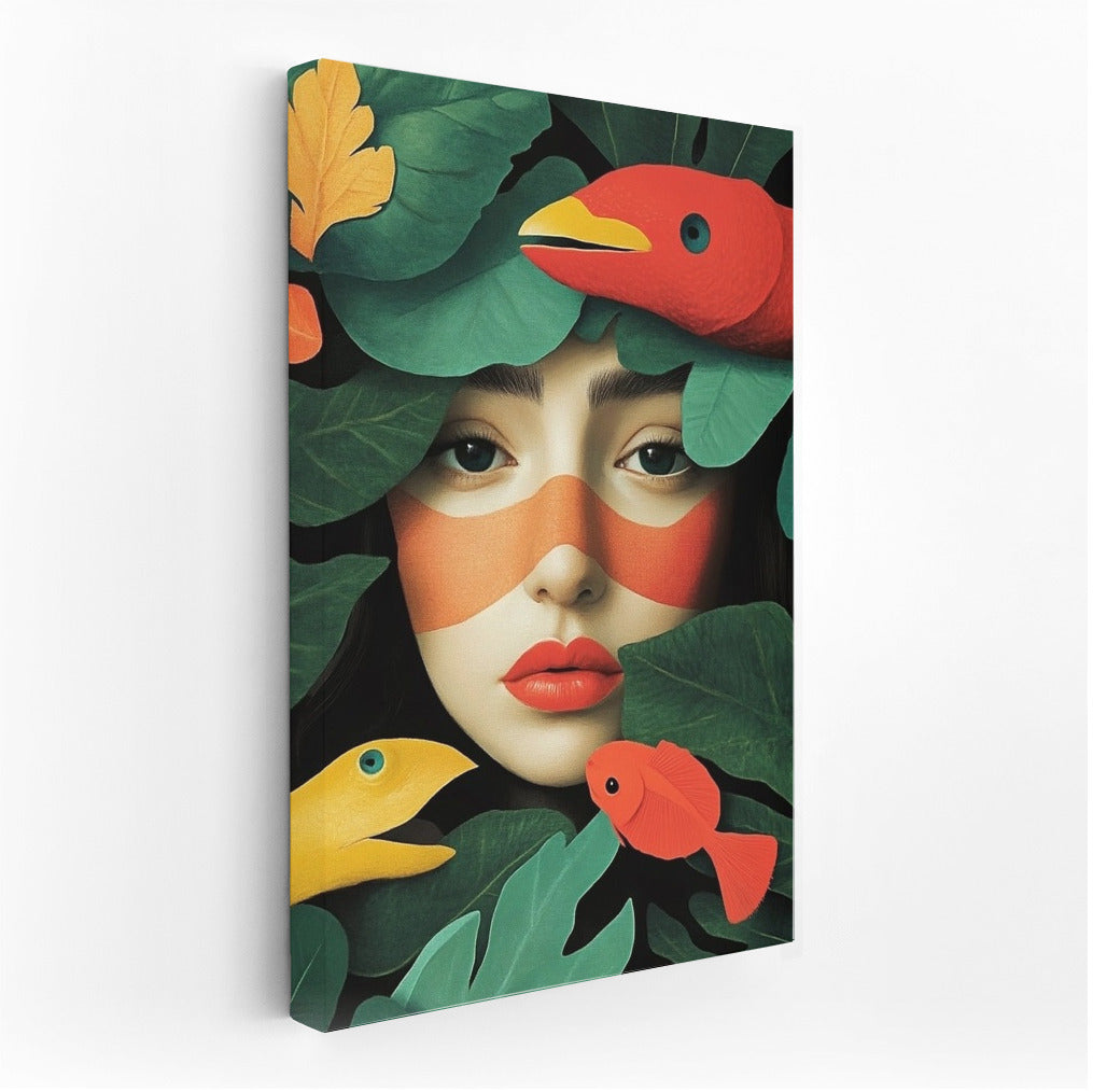 Magical poster: face framed by colorful leaves and fish. Wall art for those who seek harmony of color and form. See more from the collection: Mixed Wall Art