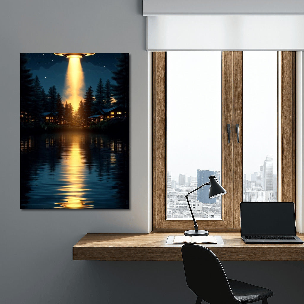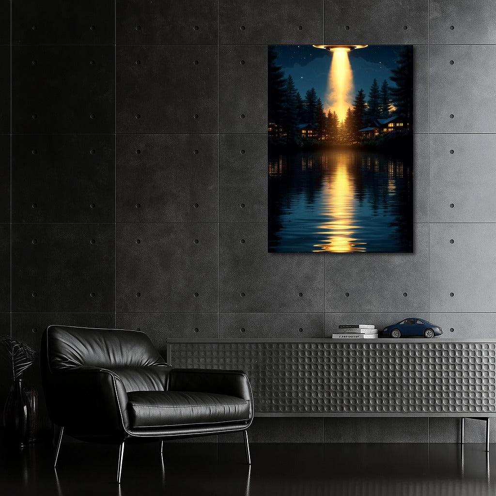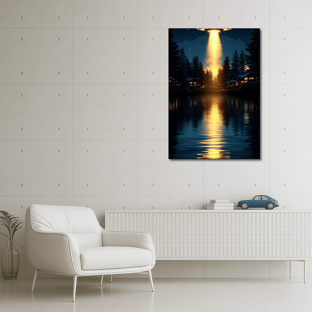 Night sky, glowing UFO over mysterious forest by the lake. Painting to create a mysterious atmosphere at home. See more from the collection: Mixed Wall Art