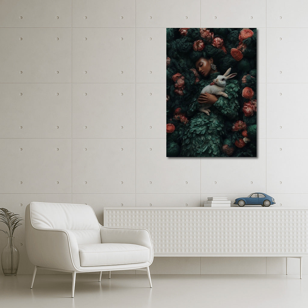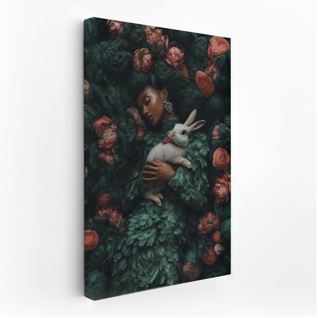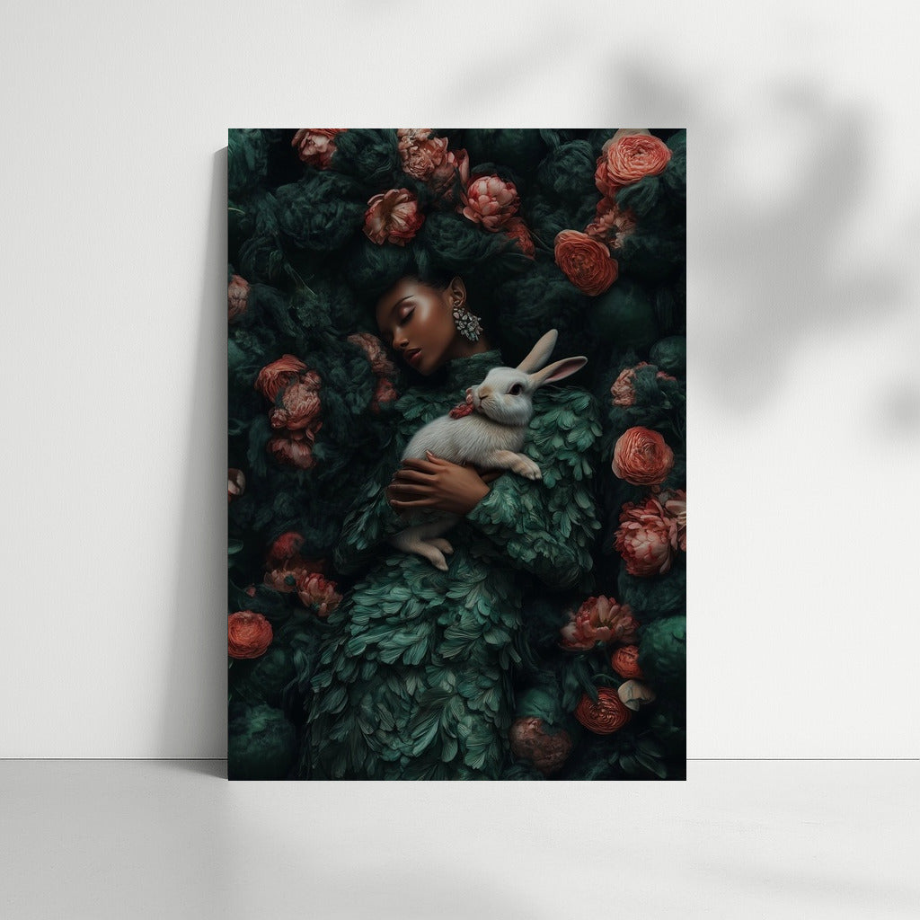 Dive into a dream with this painting: girl in greenery and flowers hugging a rabbit - delicate wall art for home. See more from the collection: Mixed Wall Art