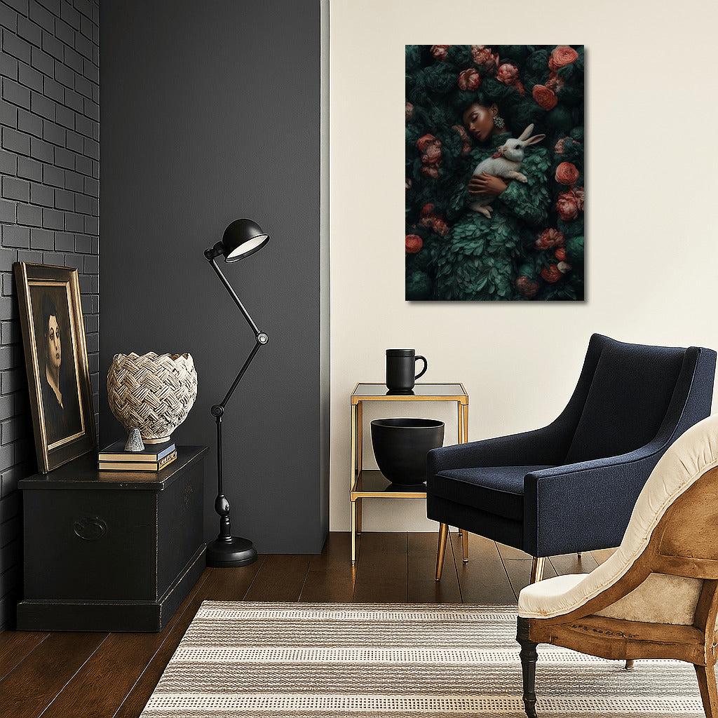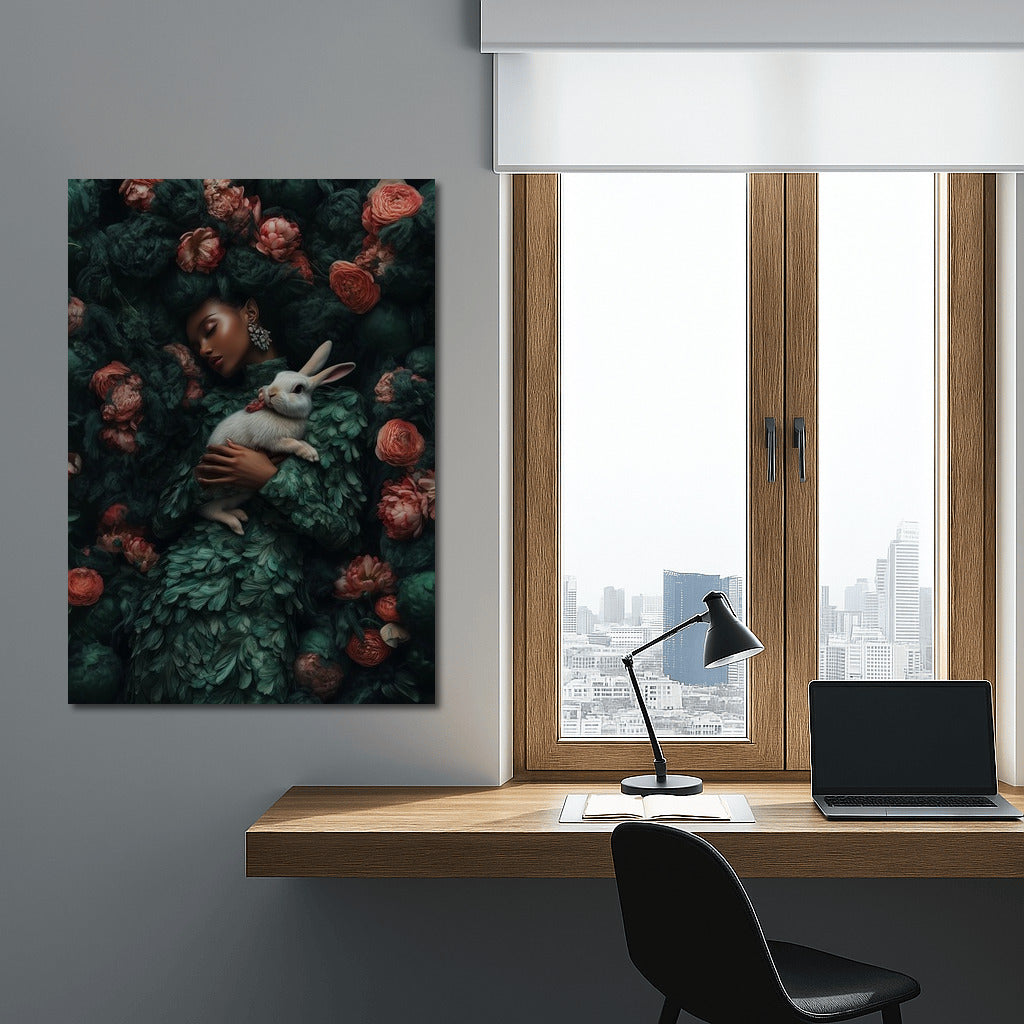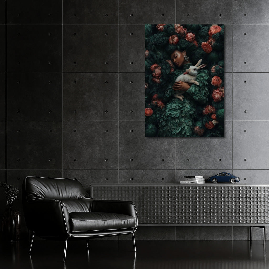 Dive into a dream with this painting: girl in greenery and flowers hugging a rabbit - delicate wall art for home. See more from the collection: Mixed Wall Art