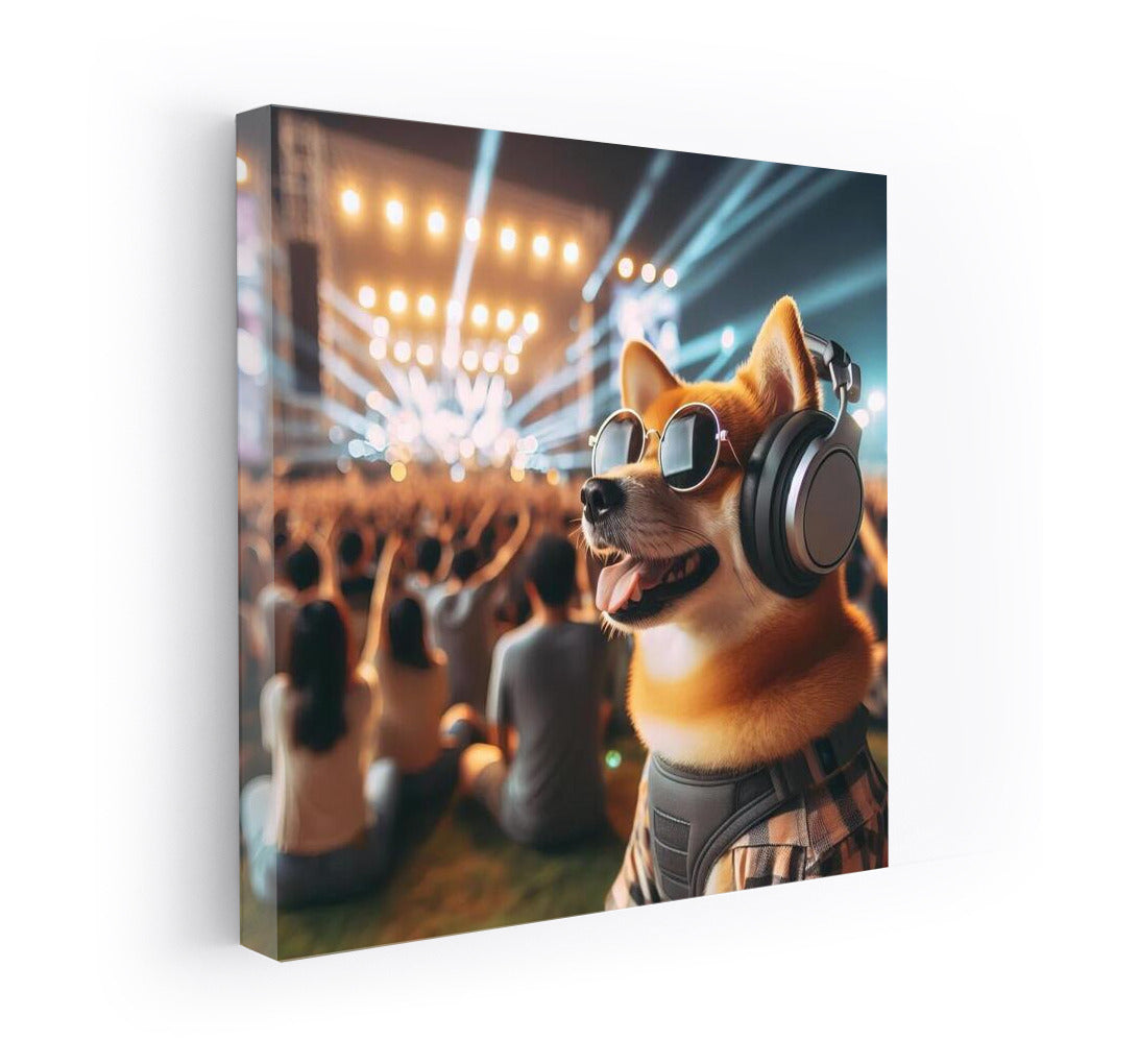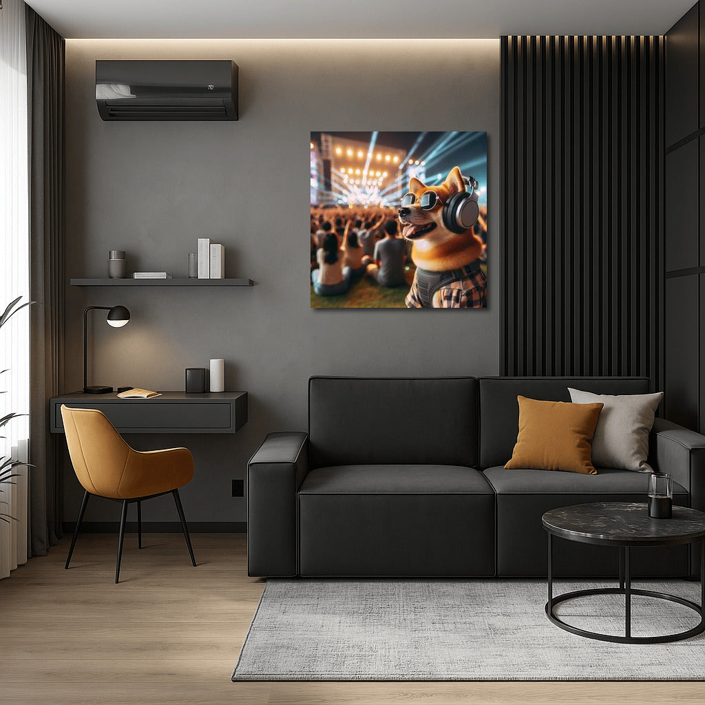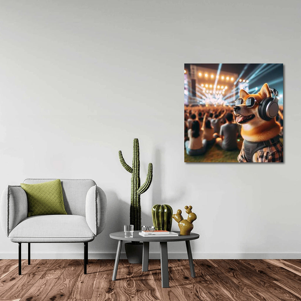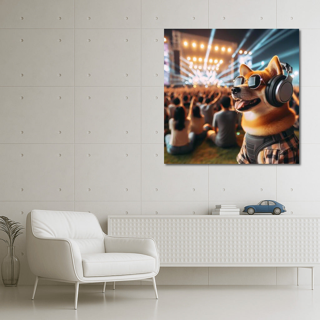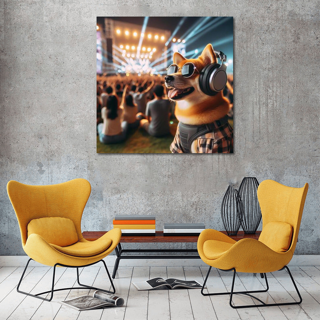 The poster shows a dog at a music festival, wearing headphones and glasses - the energy of celebration and freedom on your wall! See more from the collection: Animals Art