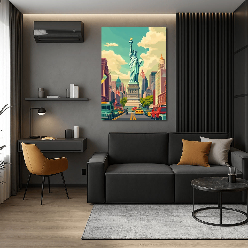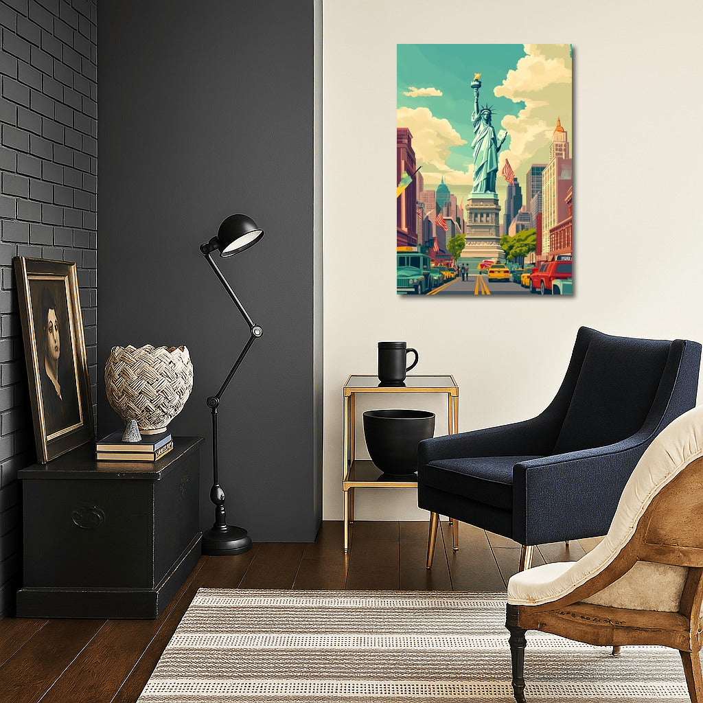Urban splendor: Statue of Liberty among skyscrapers. A bright poster for your wall, the embodiment of dynamics and freedom. See more from the collection: Cityscapes & Skylines Art
