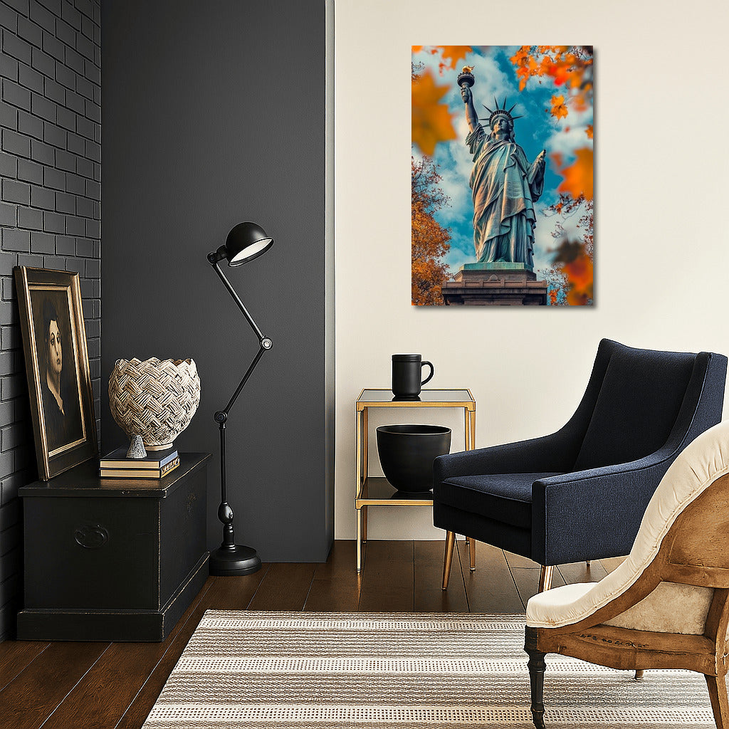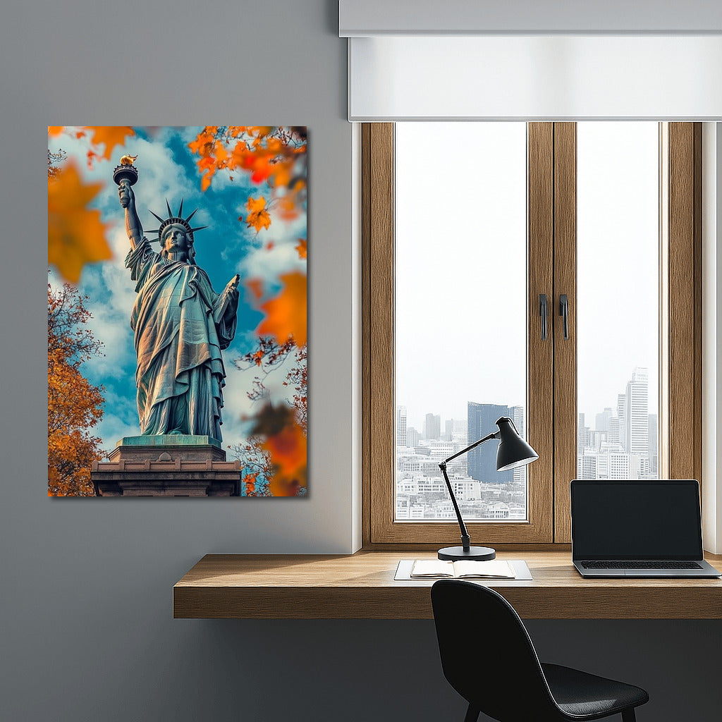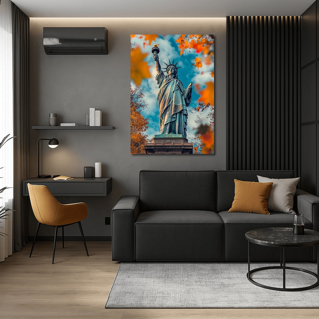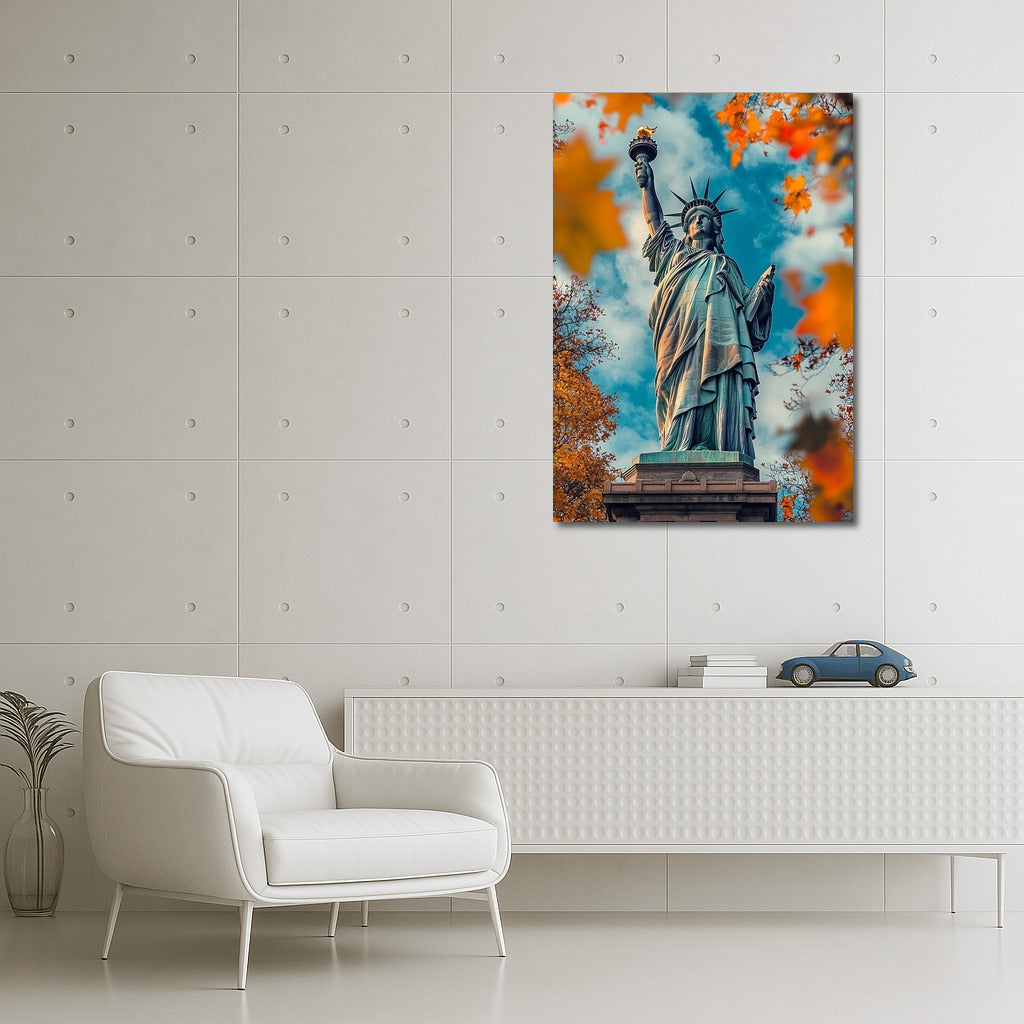 Autumn Symphony of Freedom: A poster featuring a majestic statue surrounded by golden leaves. Wall art for any room! See more from the collection: Cityscapes & Skylines Art