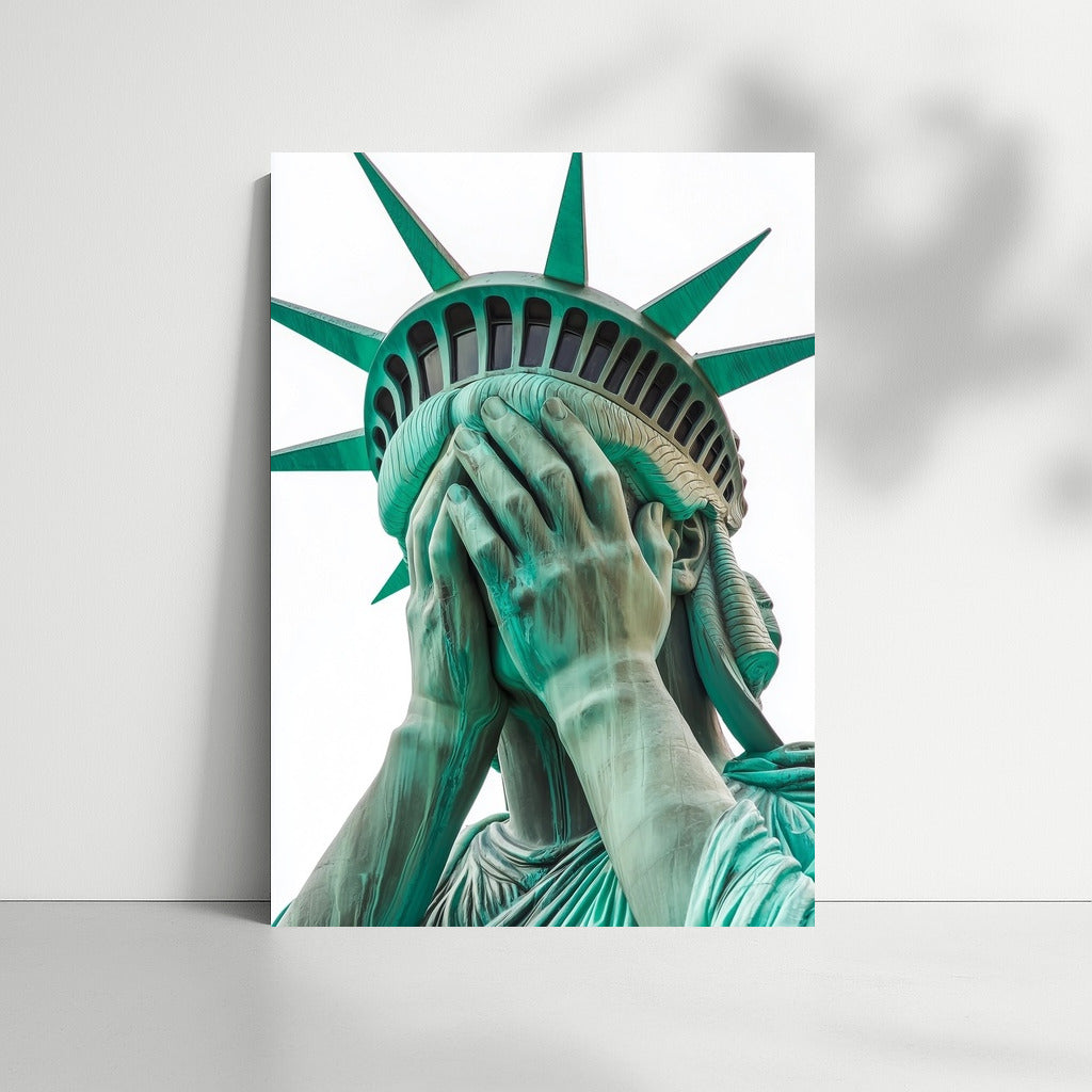 A fresh take on a classic: the Statue of Liberty hides her face. This poster is an unusual wall art for your interior. See more from the collection: Mixed Wall Art