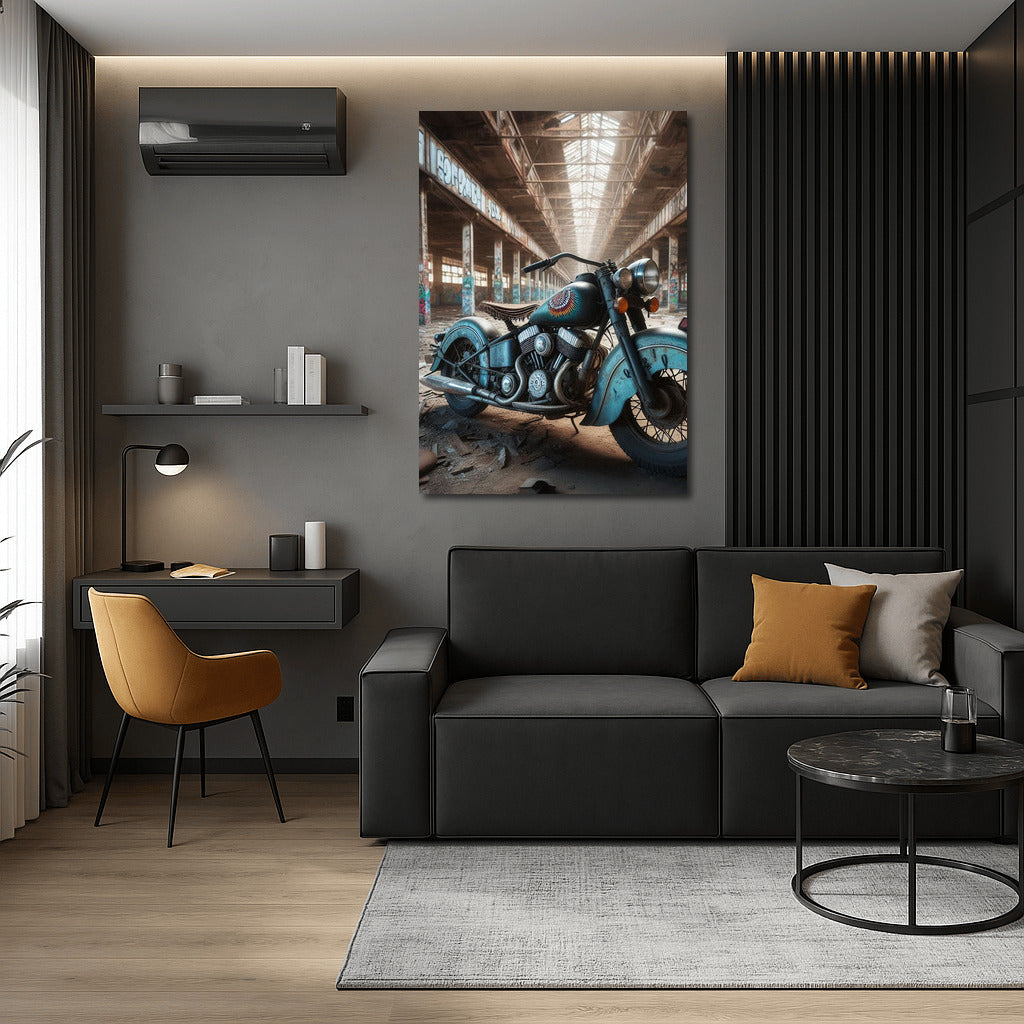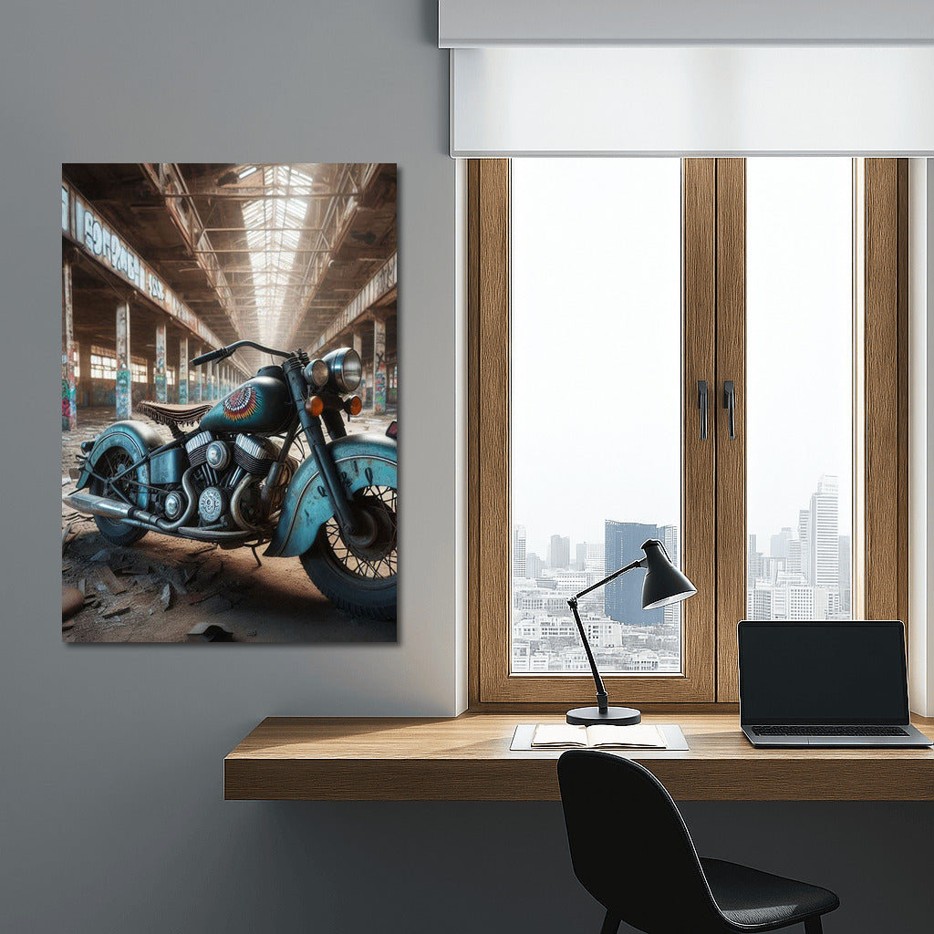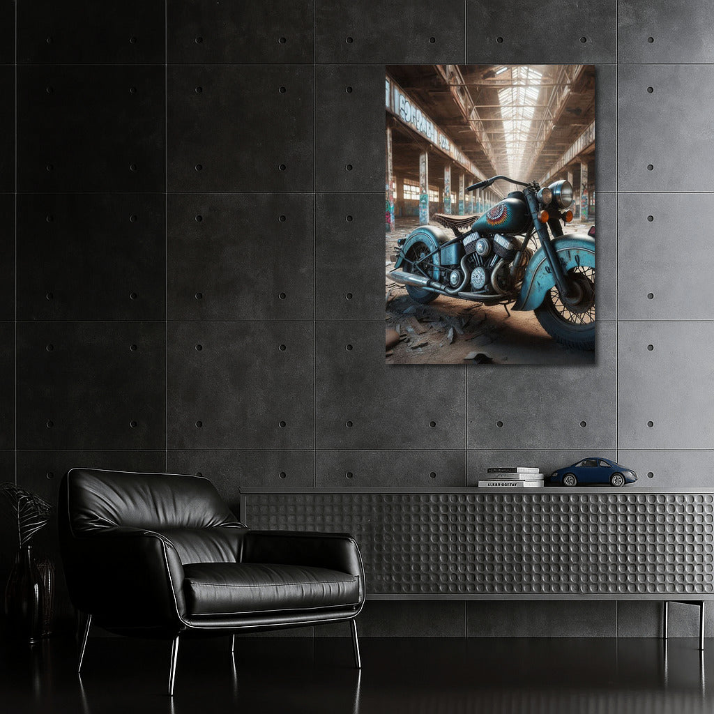 Indian Motorcycle Poster in an Abandoned Warehouse: The Spirit of Freedom and Adventure in Every Brushstroke. Wall Art for the Brave! See more from the collection: Indian Motorcycle Art