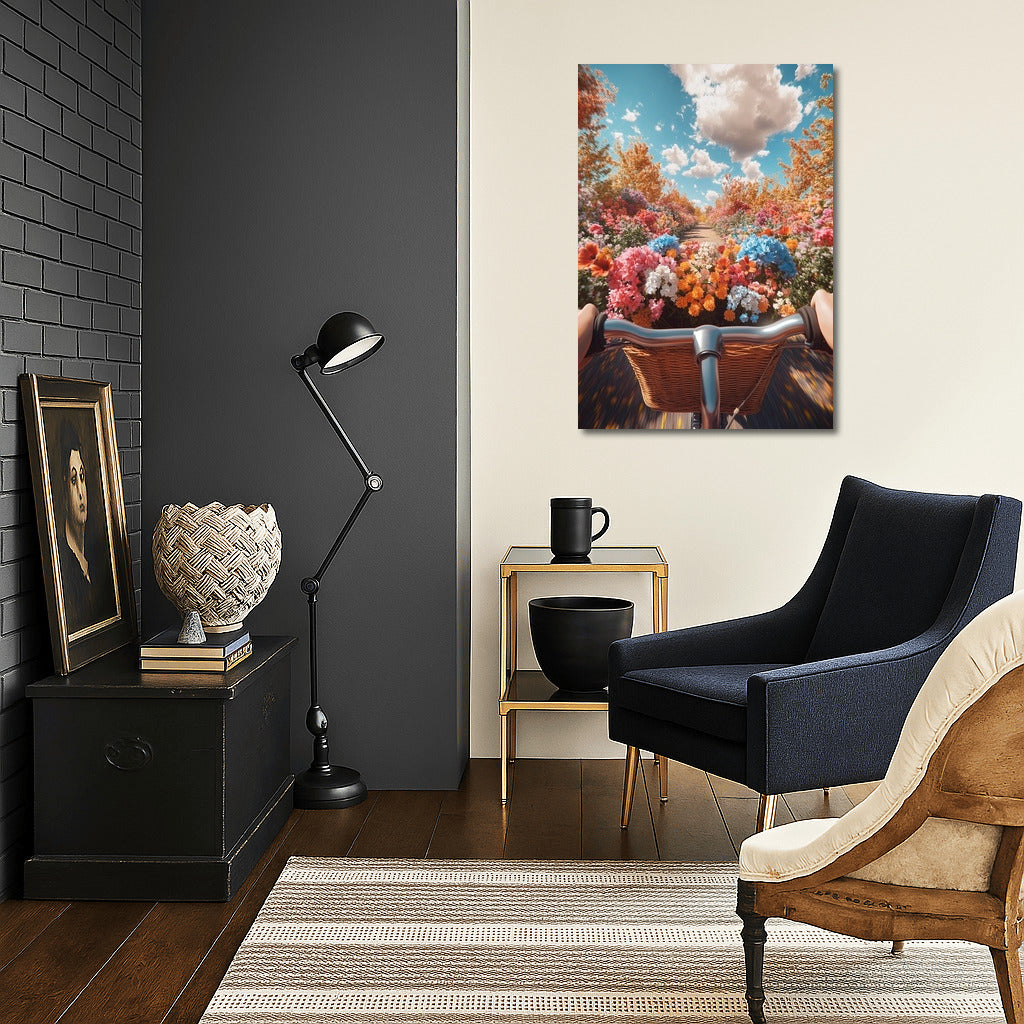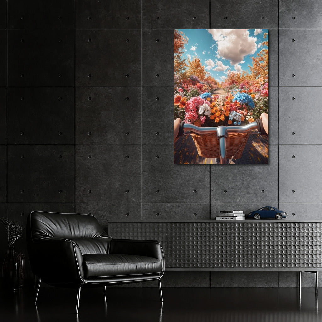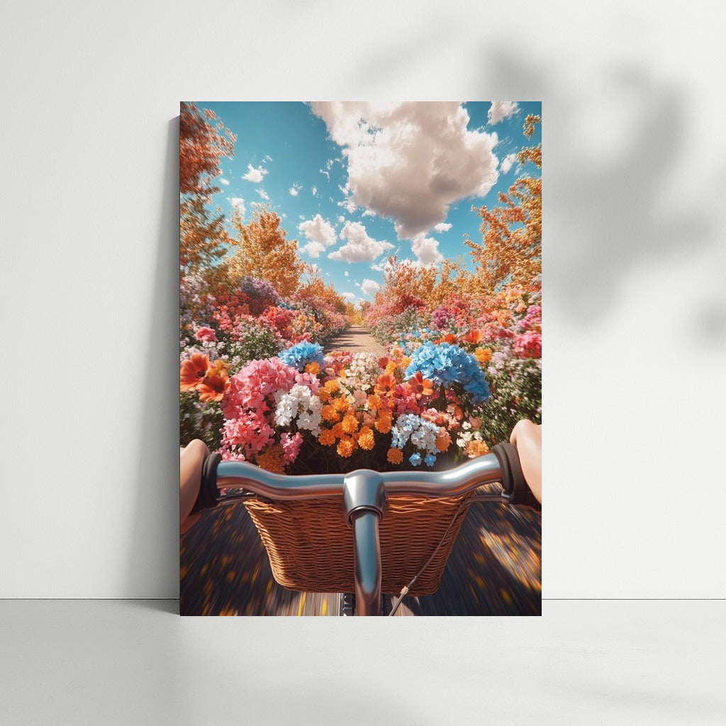 Breathe in freedom! A vibrant poster featuring a bicycle, flowers and a serene sky will bring your wall art to life, giving it a fresh color. See more from the collection: Flowers Art