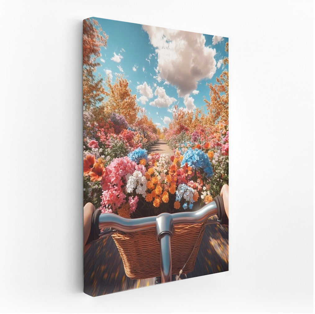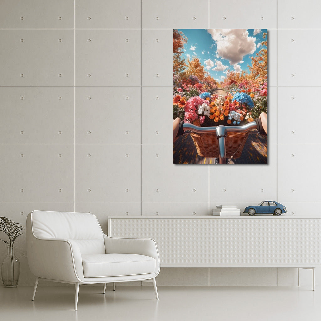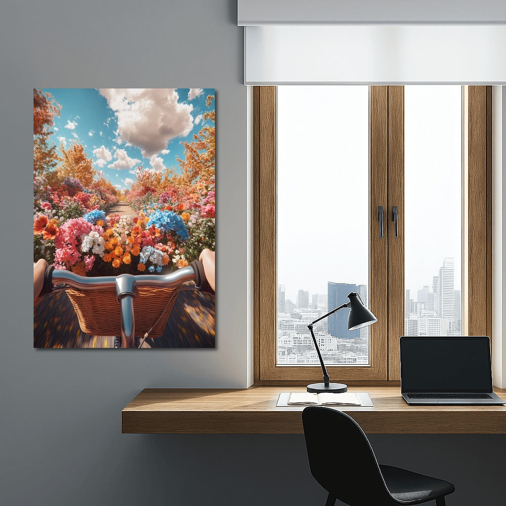 Breathe in freedom! A vibrant poster featuring a bicycle, flowers and a serene sky will bring your wall art to life, giving it a fresh color. See more from the collection: Flowers Art