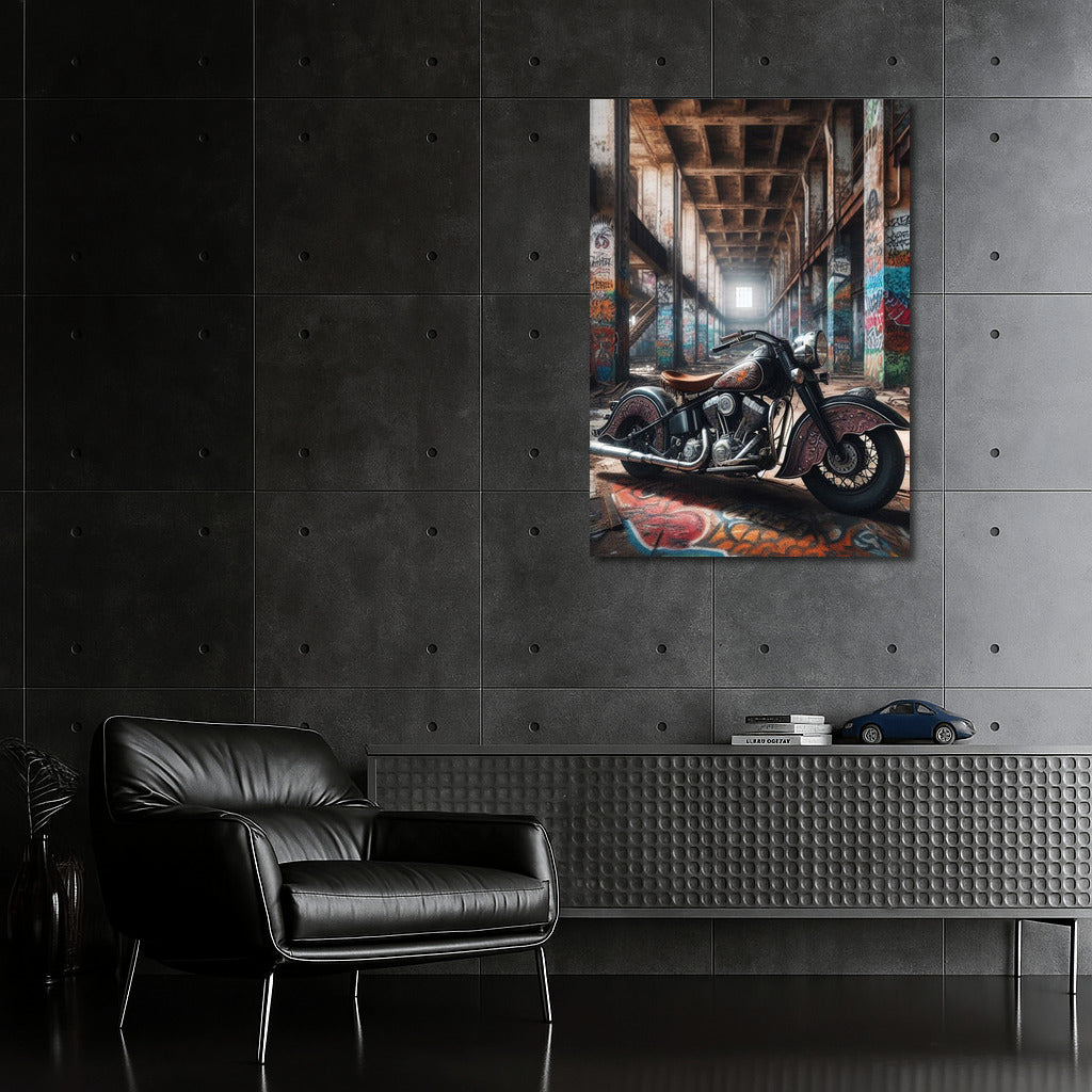 Legendary Indian motorcycle in an abandoned warehouse. Inspiring wall art that creates an atmosphere of freedom and adventure. See more from the collection: Indian Motorcycle Art