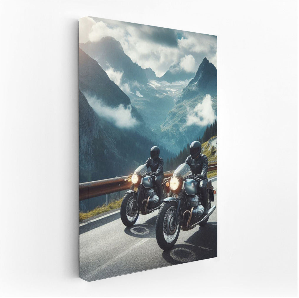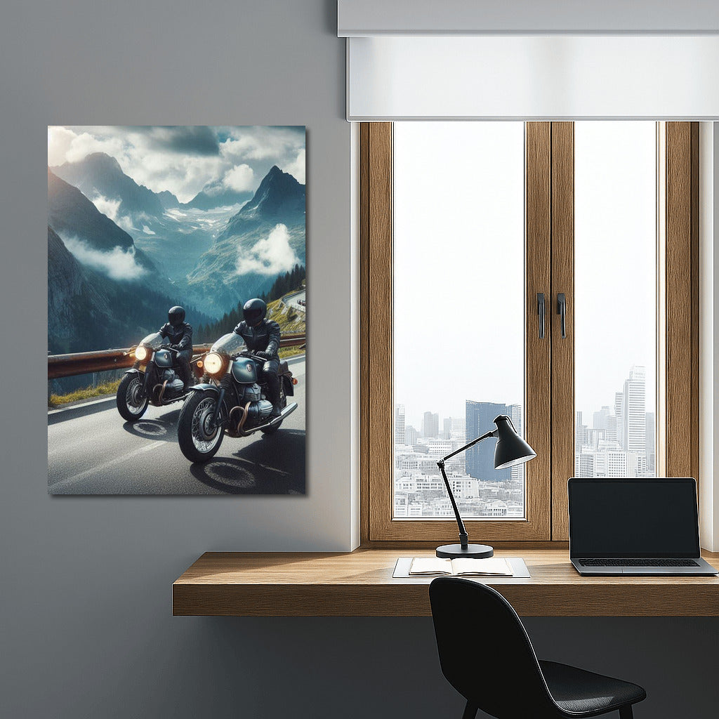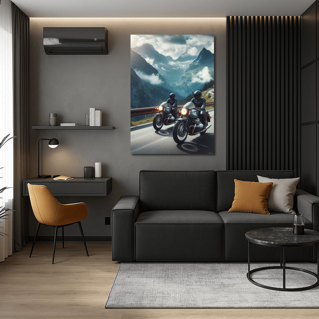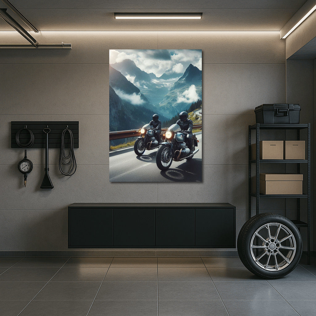 Two Moto Guzzi racing along a mountain road, embodying the spirit of freedom. Transform your interior into a masterpiece of wall art! See more from the collection: Moto Guzzi Motorcycle Art