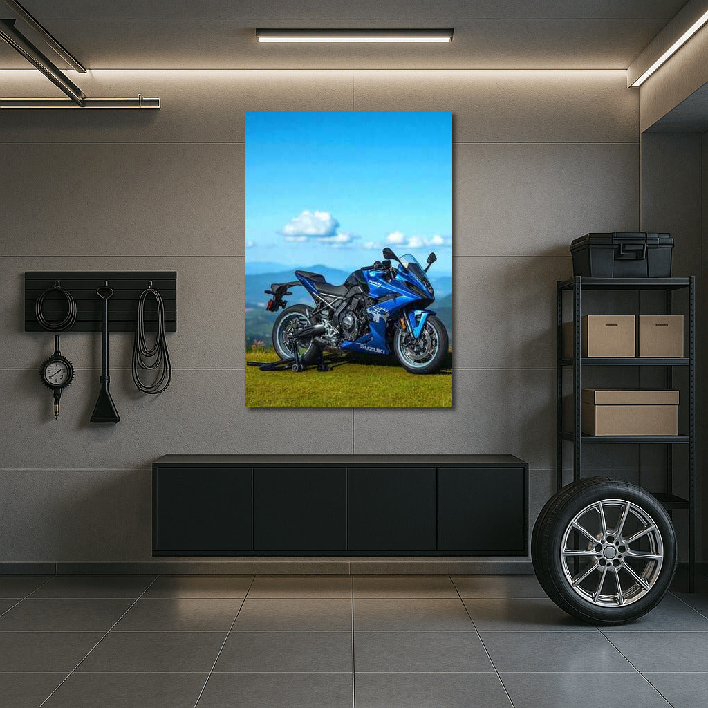 Poster with Suzuki GSX R on top of the hill: speed and freedom in the heart of nature. Perfect wall art for motorcycle lovers! See more from the collection: Motorcycles Art