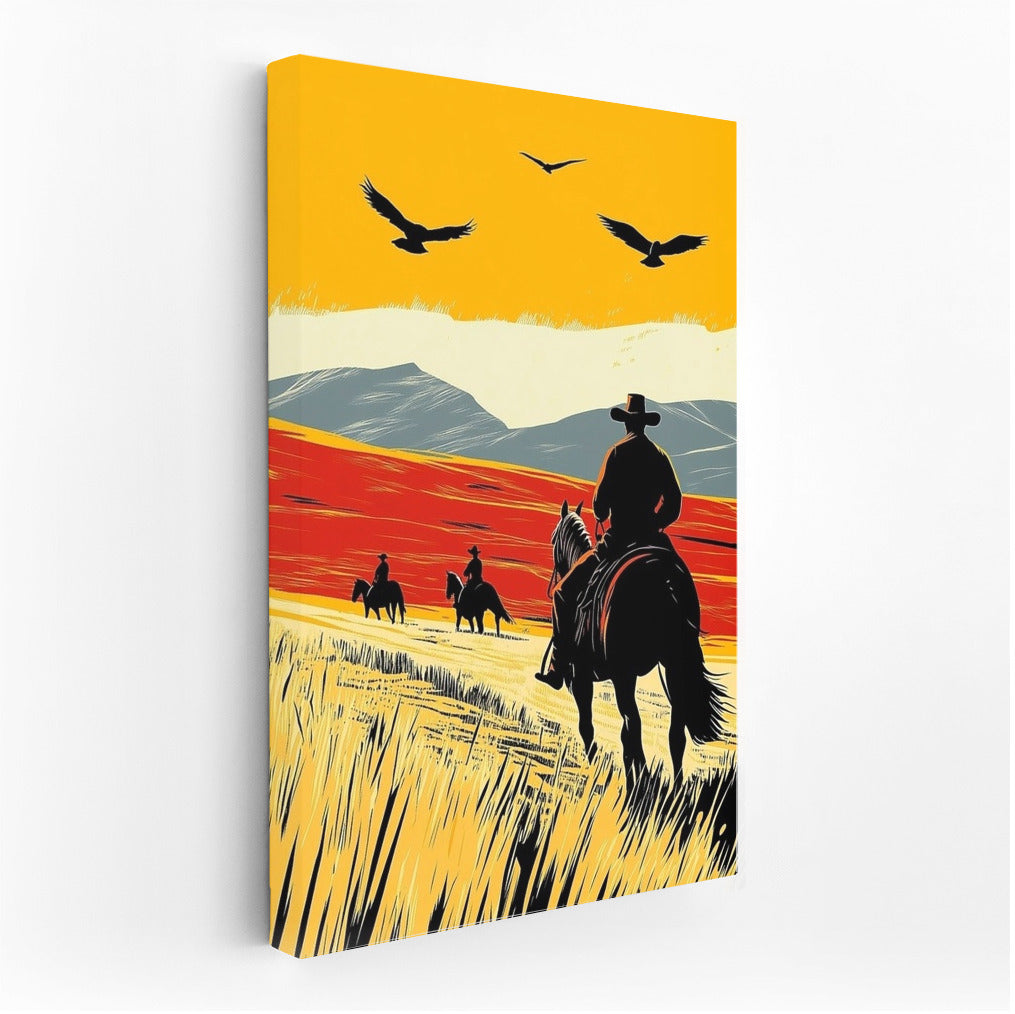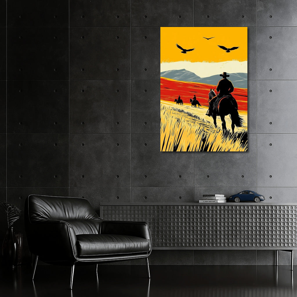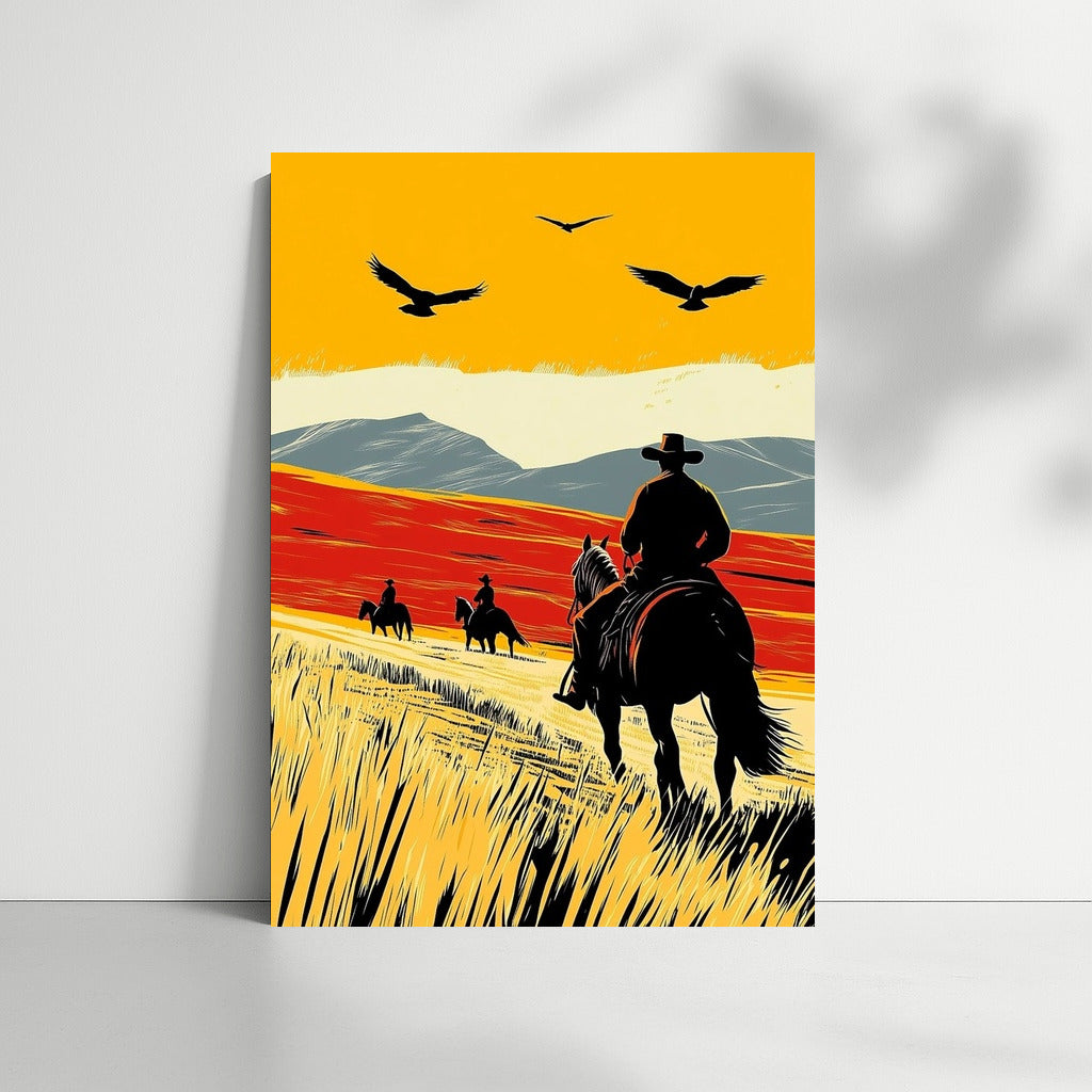 Poster of cowboys in the vast prairie under a bright sky. Wall art that conveys the freedom and spirit of the Wild West. See more from the collection: Mixed Wall Art
