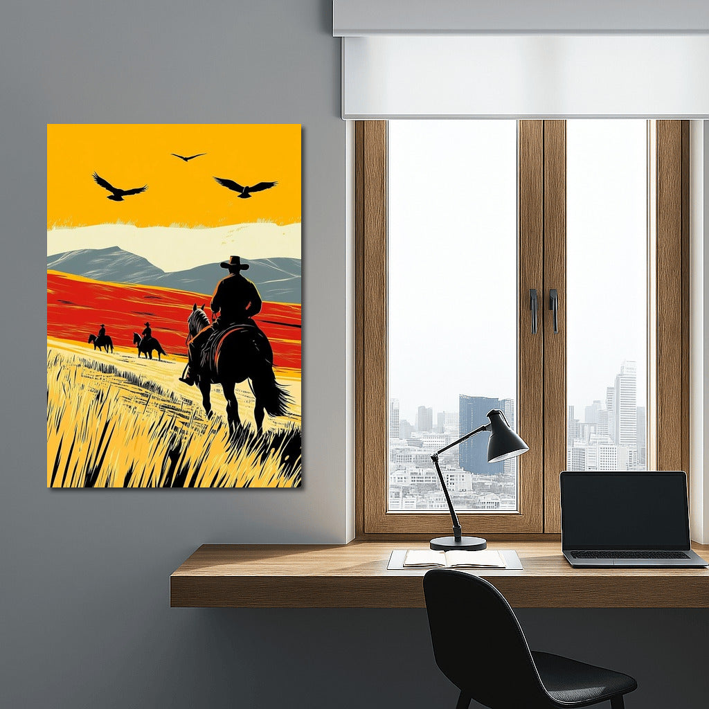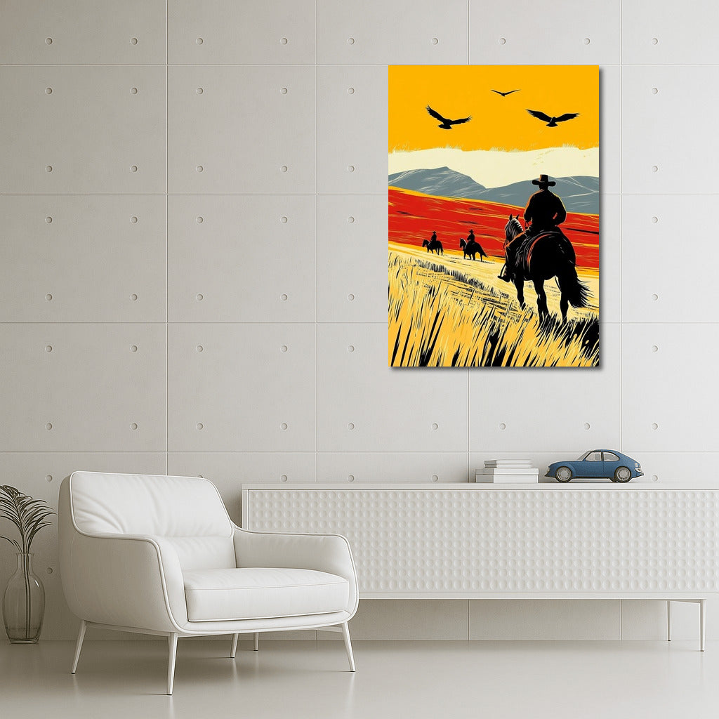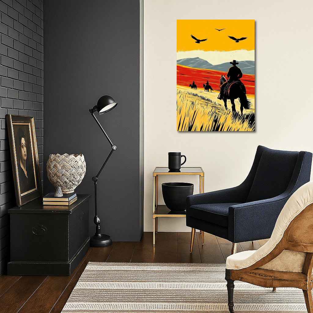 Poster of cowboys in the vast prairie under a bright sky. Wall art that conveys the freedom and spirit of the Wild West. See more from the collection: Mixed Wall Art