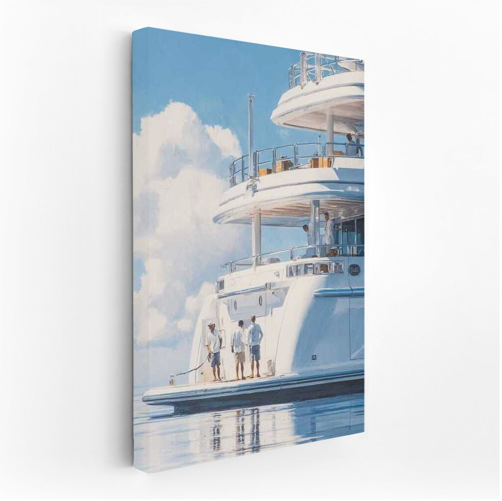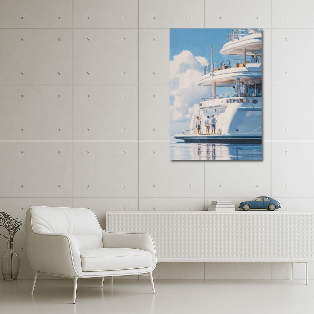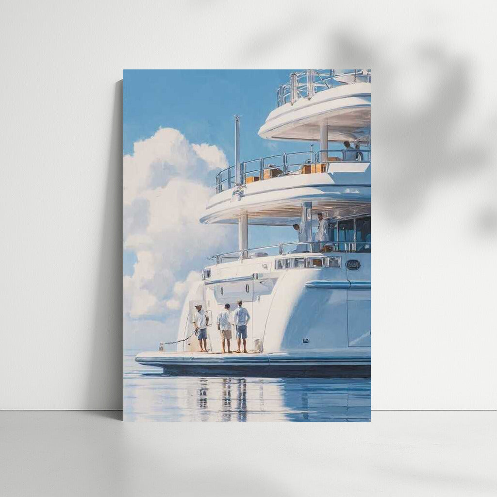 A poster of a luxury yacht sailing towards the horizon. Wall art that embodies the freedom and style of transport adventures. See more from the collection: Transport Art