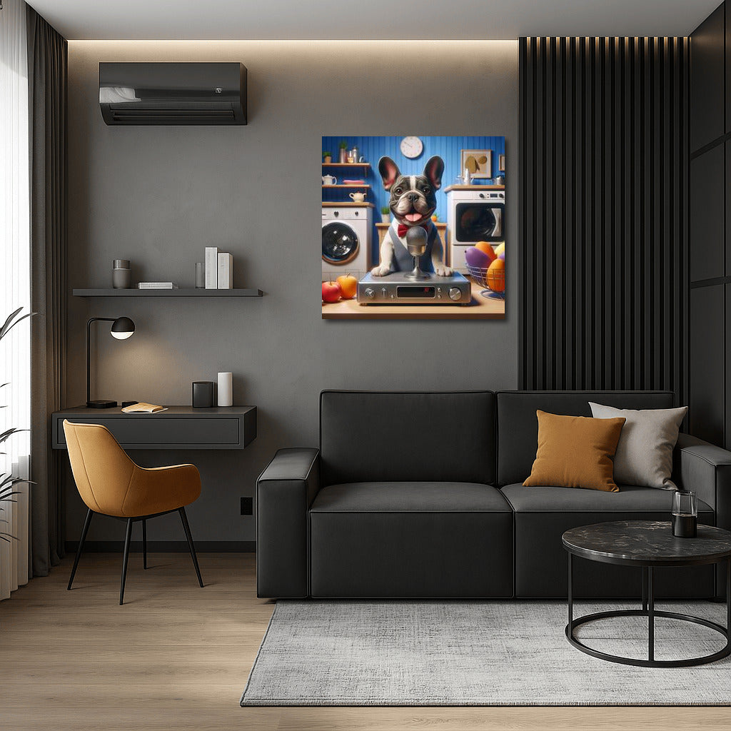 French Bulldog hosts TV show in the world of live technology. Bright poster will liven up your interior and add a pinch of magic! See more from the collection: Animals Art