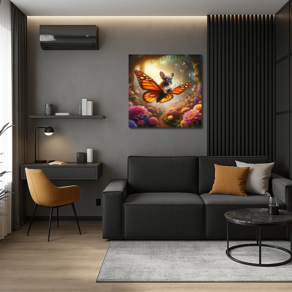 French bulldog on a butterfly in a magical forest among giant flowers Wall Art