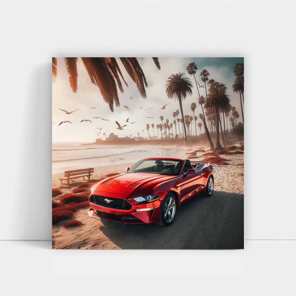 The poster is pure joy for car fans: a Ford Mustang, brand new, as if it just came off the assembly line, is parked on the beach. This wall art simply screams speed and courage. A painting for those who understand what a real drive is. See more from the collection: Ford Art