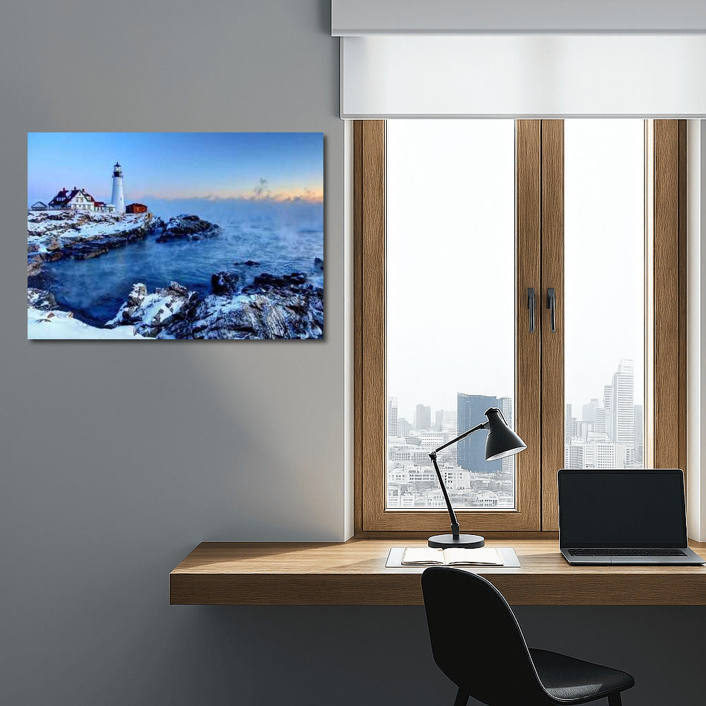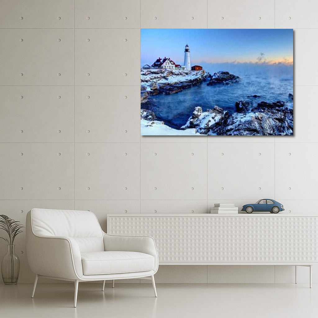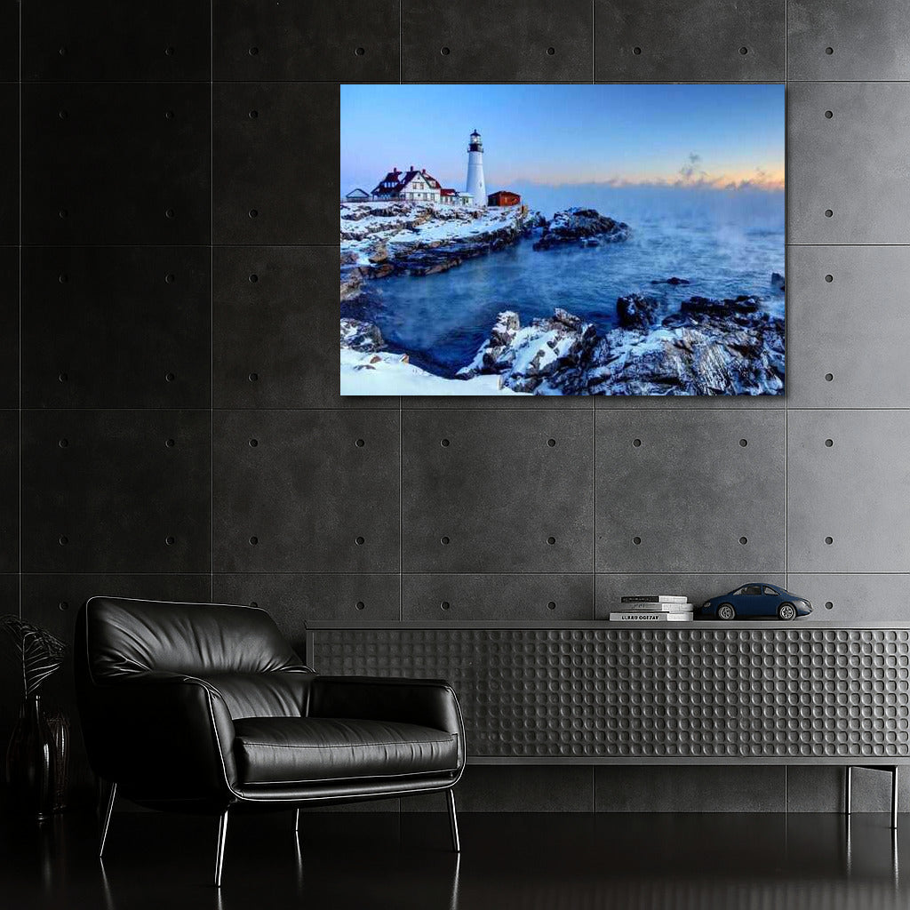 A frosty morning in Maine: a majestic lighthouse frames the rugged beauty of the coast. A perfect poster for the soul. See more from the collection: Country Art