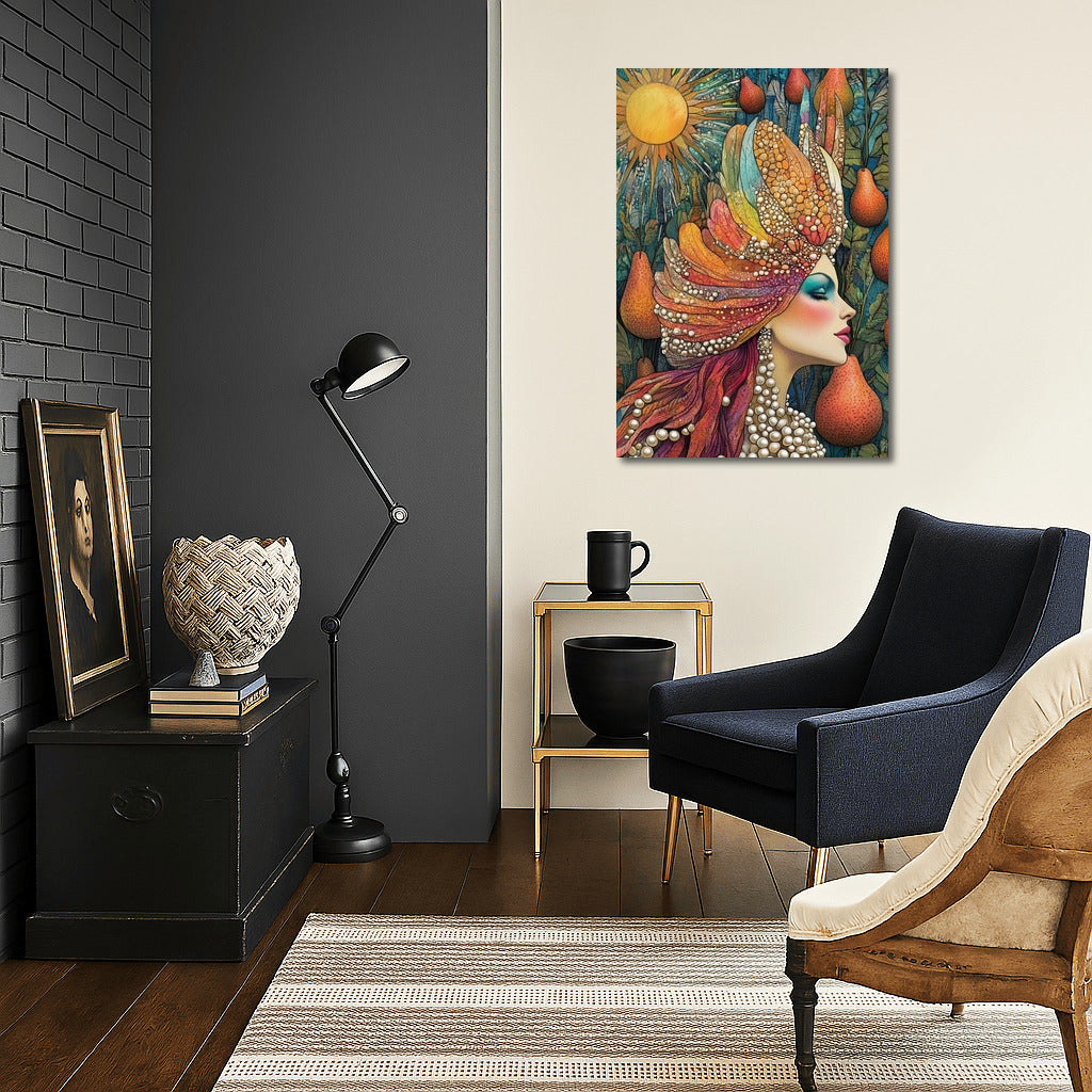 A vibrant poster featuring a graceful profile surrounded by fruits and feathers. Wall art that embodies dreams and fantasies. See more from the collection: Mixed Wall Art