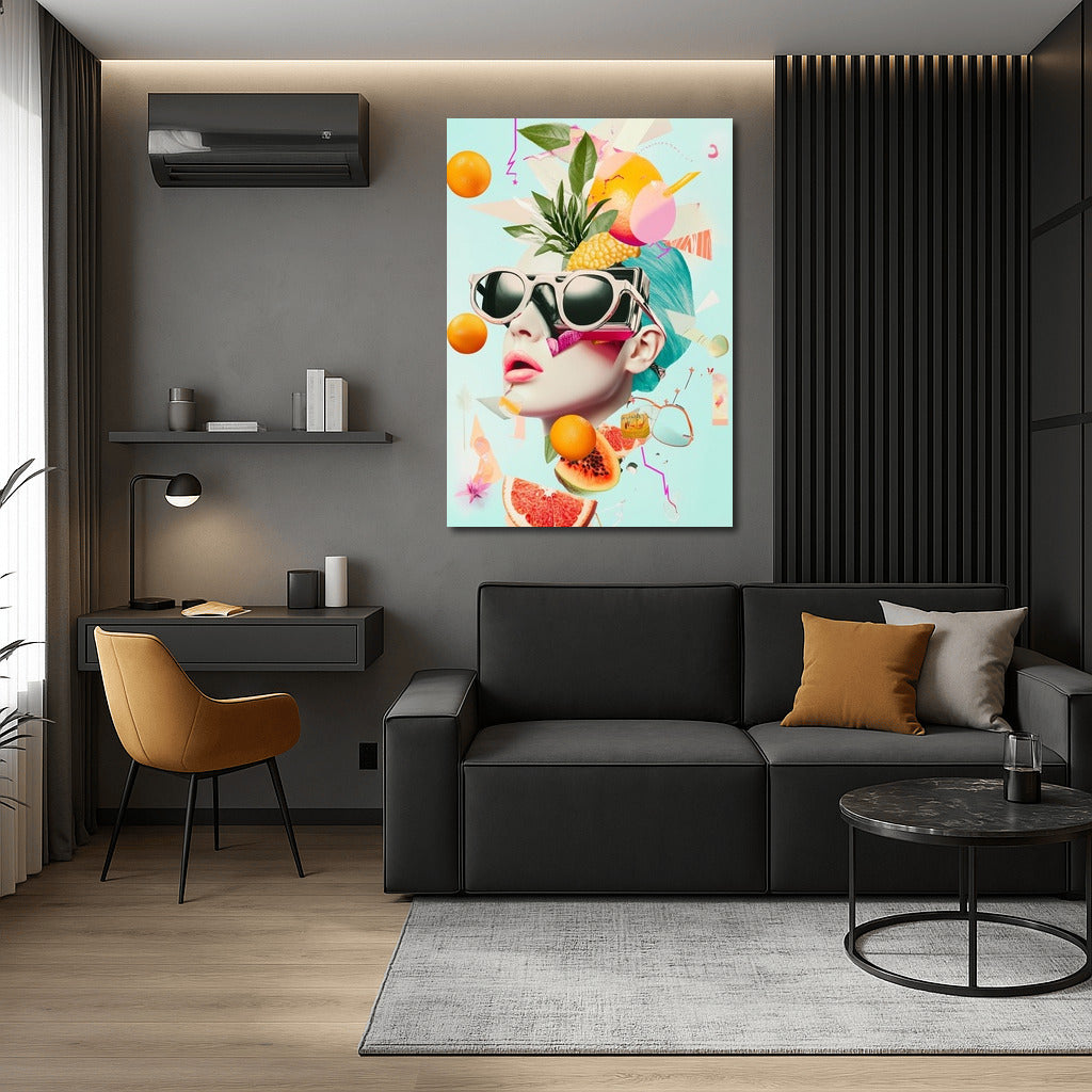 A bright poster with an abstract collage: fantasy images and fruit elements on a soft blue background. Add juiciness to the walls! See more from the collection: Mixed Wall Art