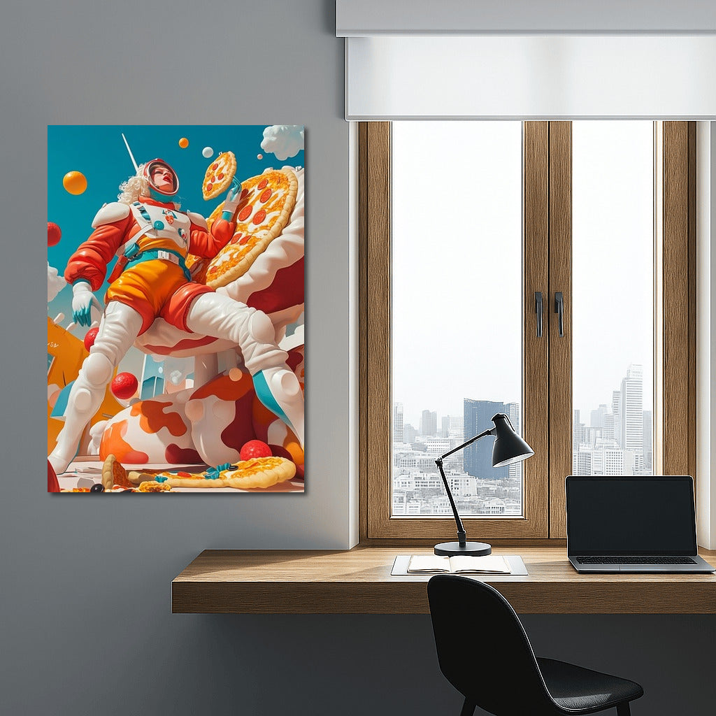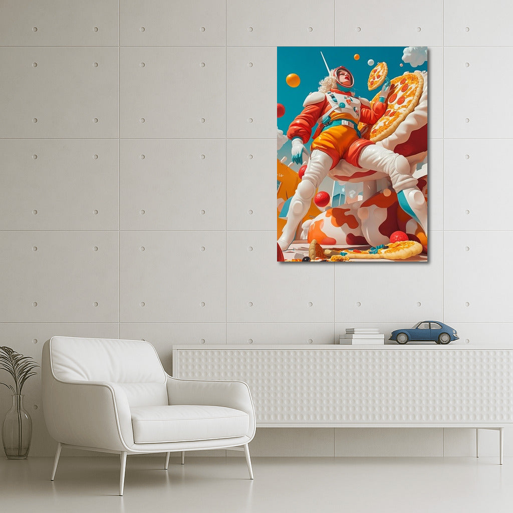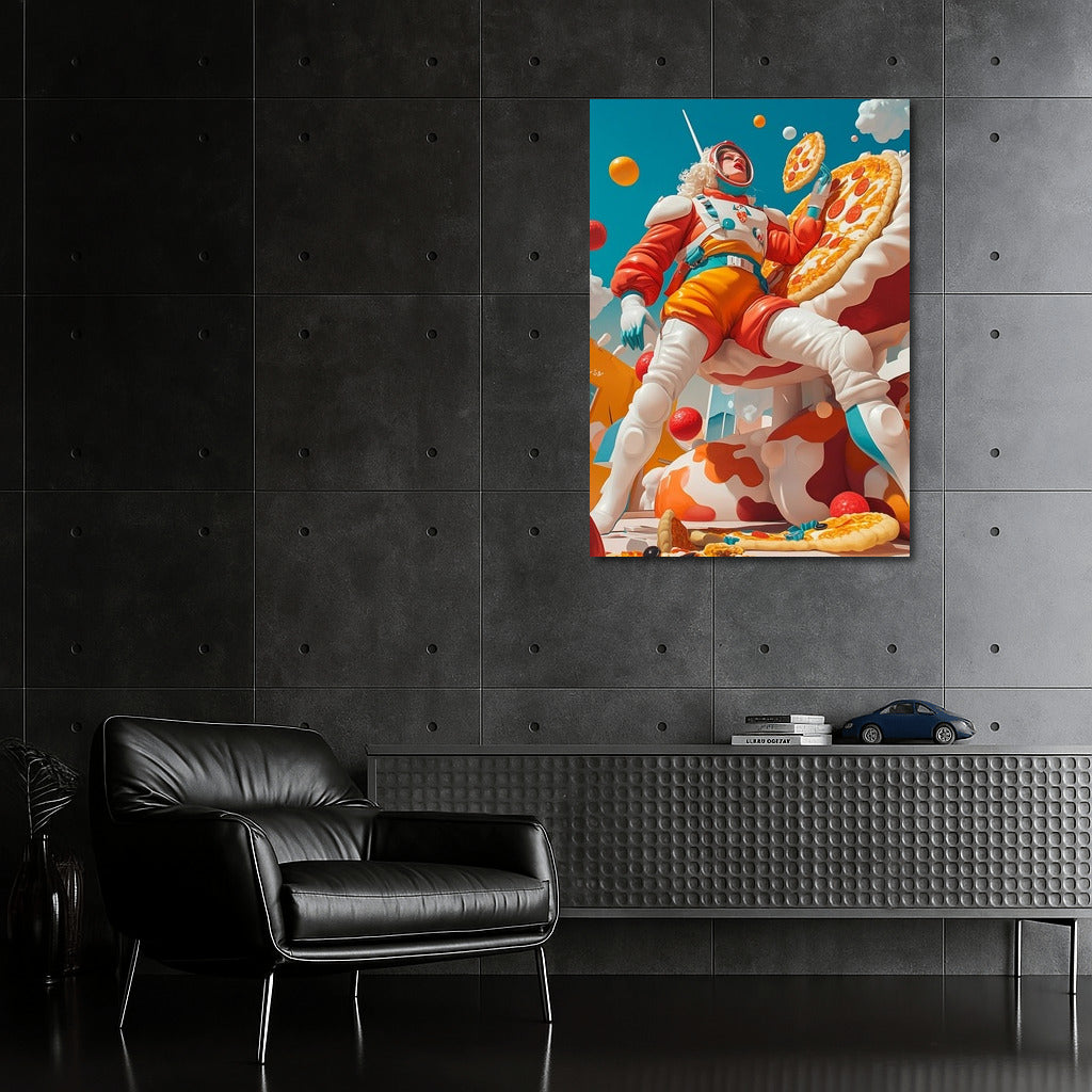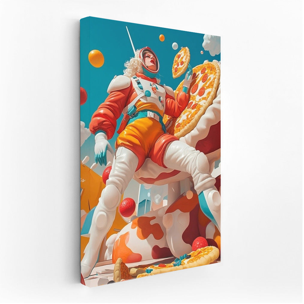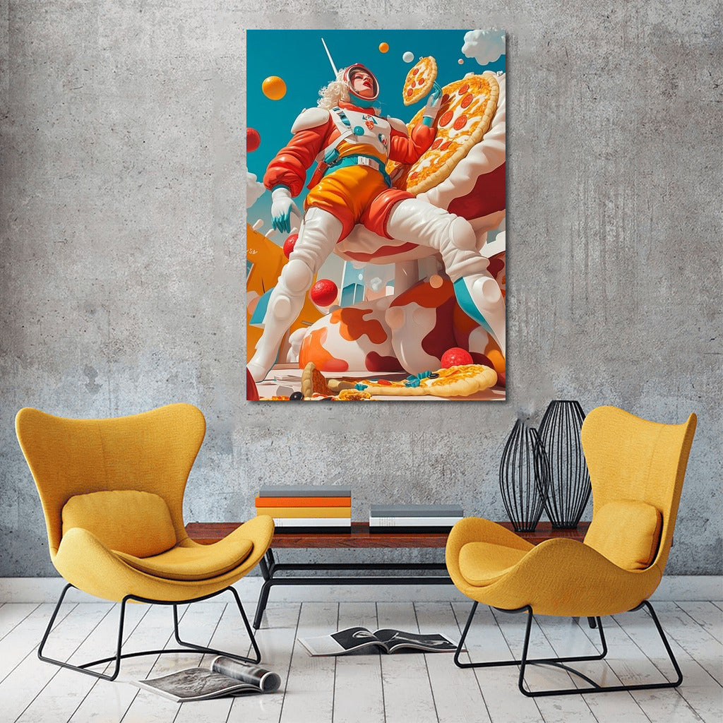 Space Odyssey of Taste: a bright poster with a girl in a spacesuit and pizza, creating the effect of an extraterrestrial culinary adventure! See more from the collection: Pop Art
