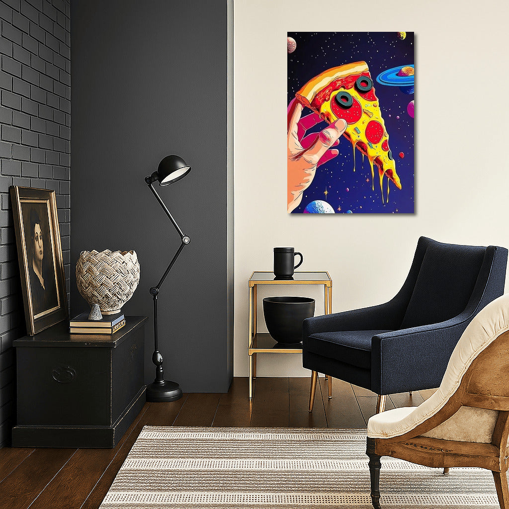 Space adventure with a slice of pizza! This colorful poster will become a bright accent of your wall art. See more from the collection: Space & Astronomy Art