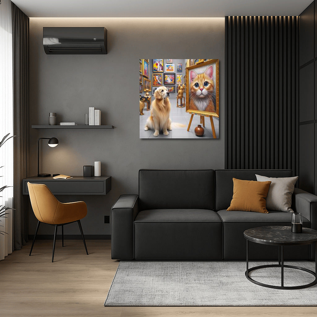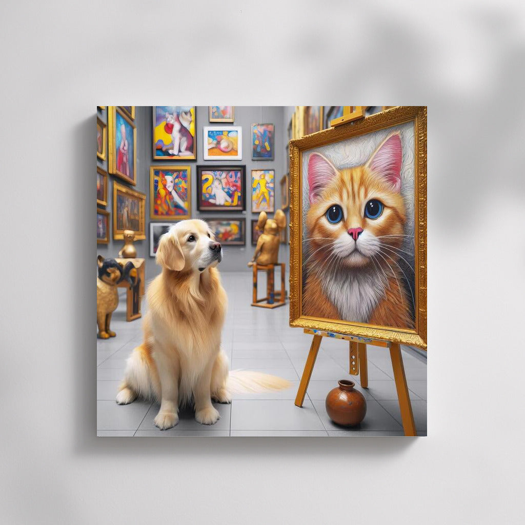 A dog in an art gallery admires a painting of a cat. Adorable wall art for your home! See more from the collection: Animals Art