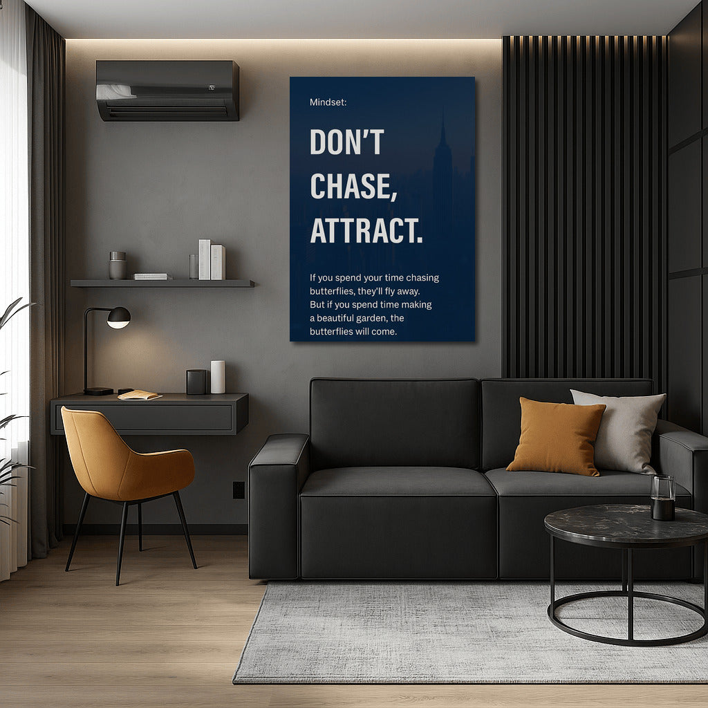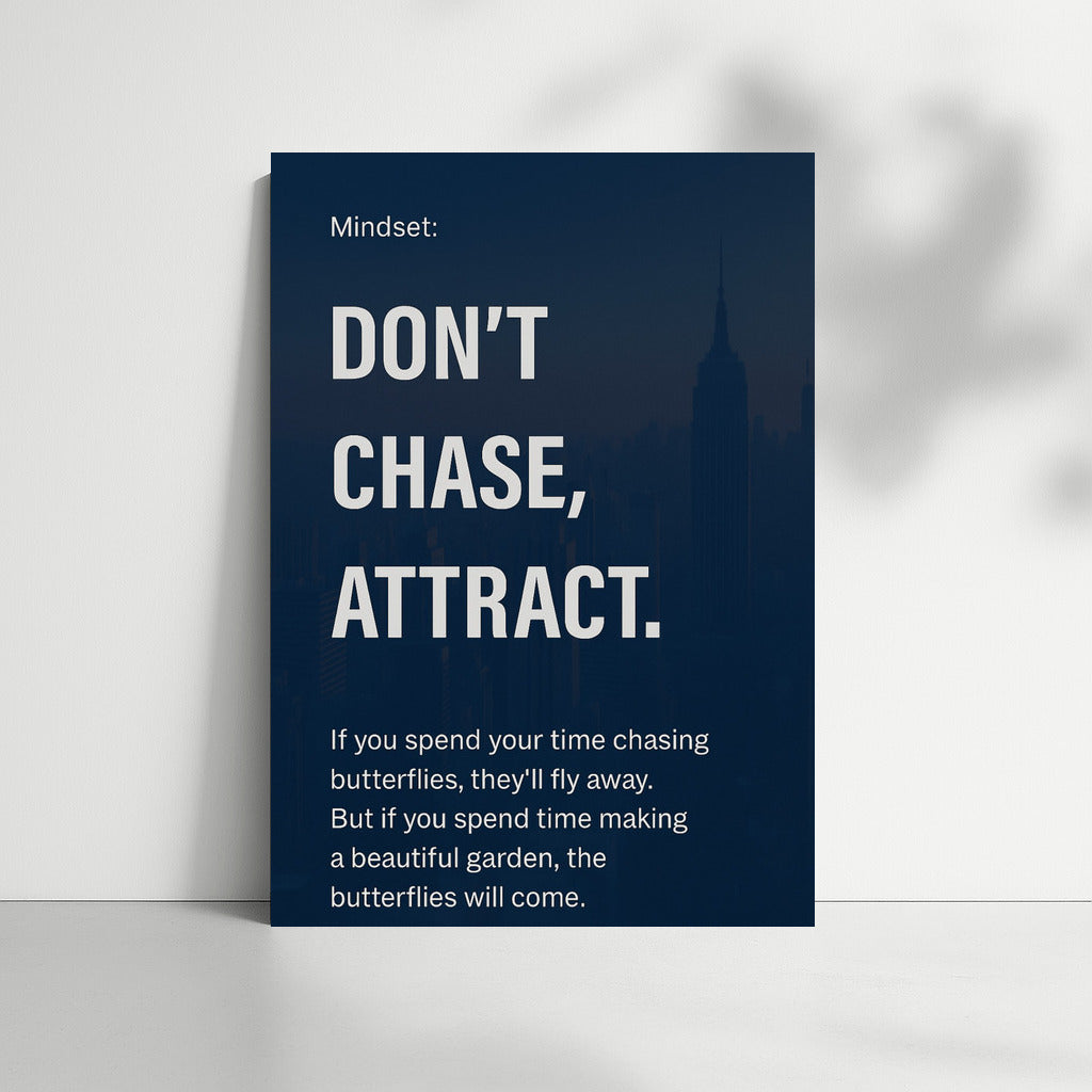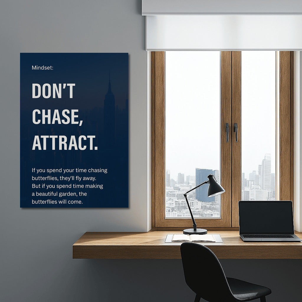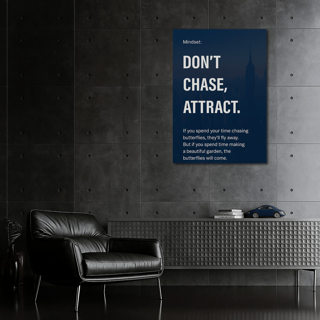 Mindset Wall Art: Don't chase, attract. Reminds you to create a garden of purpose where the butterflies of self-improvement come flying to you. See more from the collection: Inspirational & Motivational Quotes Art