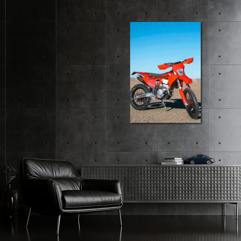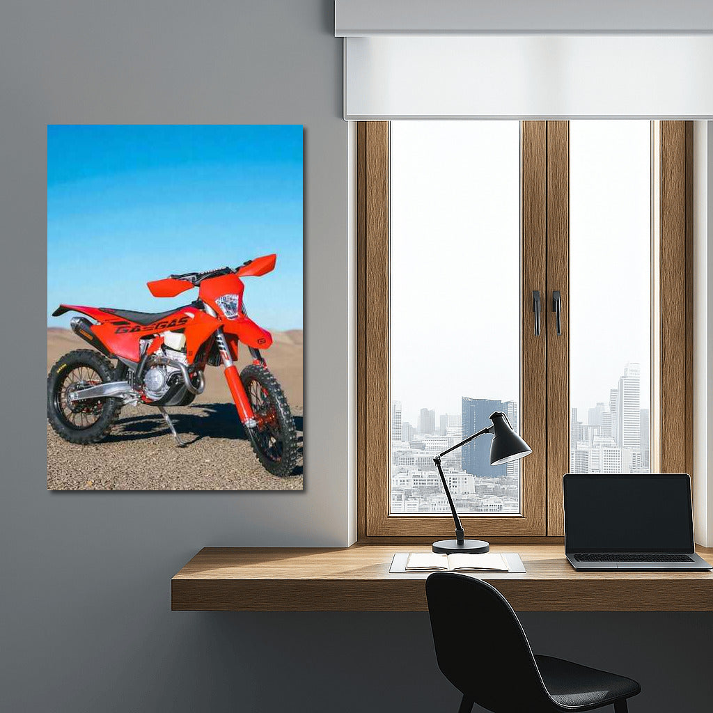 GasGas EC 350F poster: power on a gravel road with sand dunes behind. Perfect wall art for motorcycle lovers! See more from the collection: GasGas Motorcycle Art