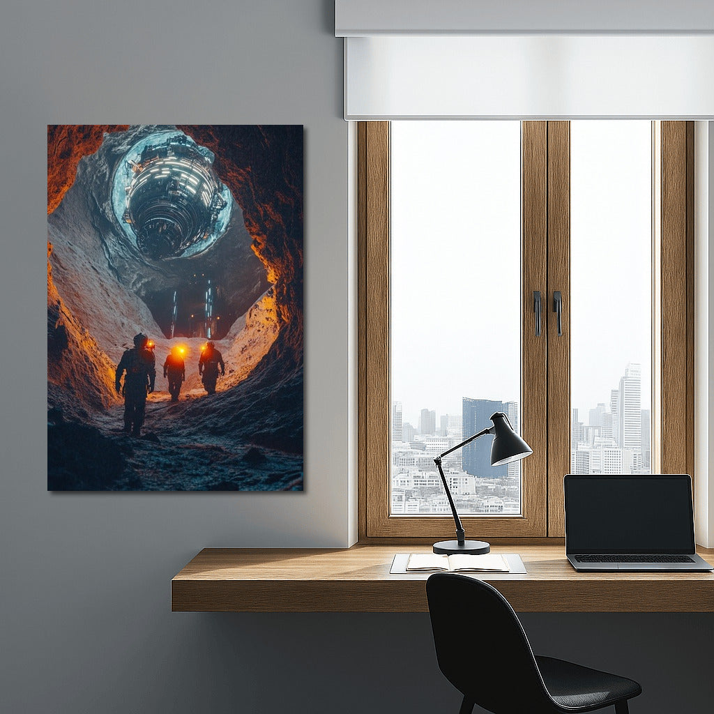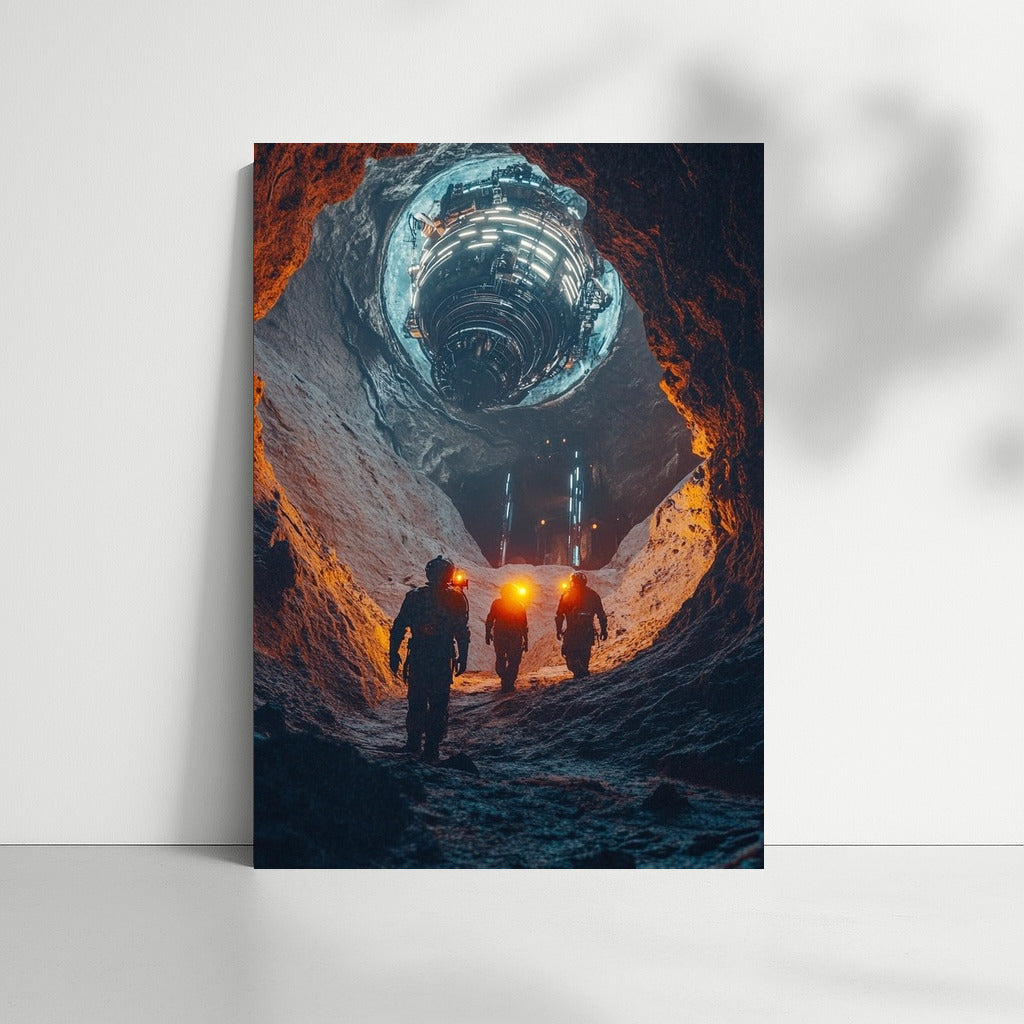 Mysterious poster: Silhouettes enter a giant cave where a majestic structure awakens the imagination of the future. See more from the collection: Space & Astronomy Art
