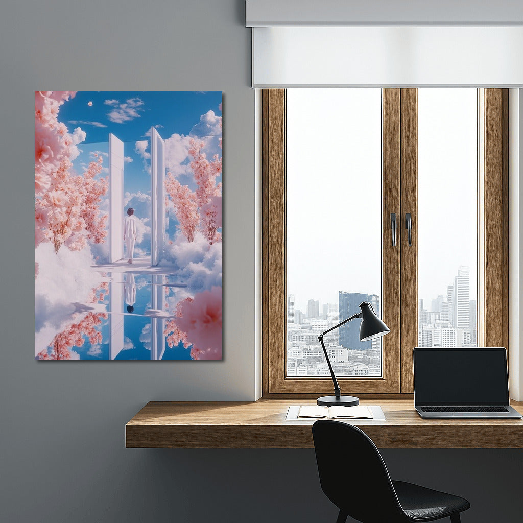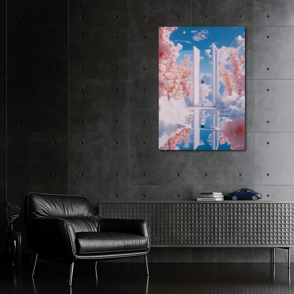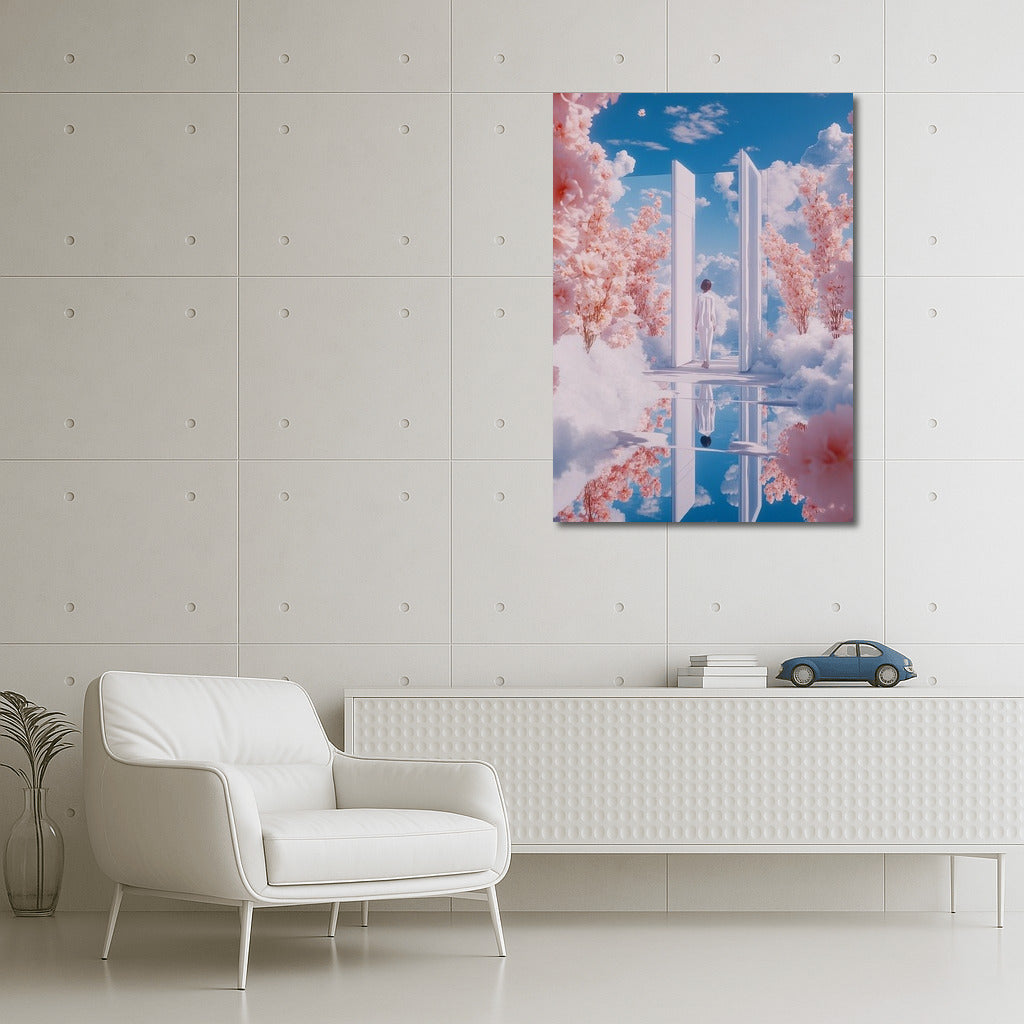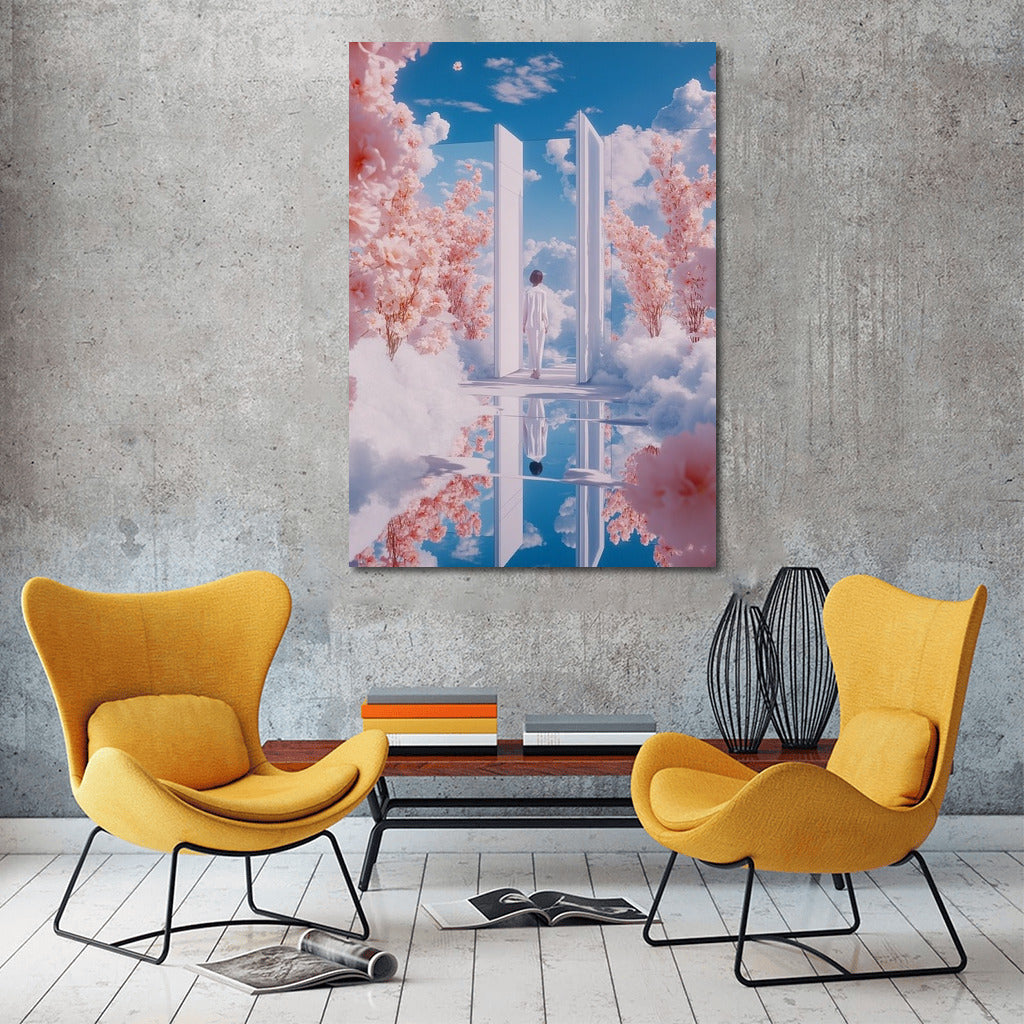 Dream Poster: Girl on the Threshold of Heavenly Garden, Enchanting Wall Art with Pink Clouds and Fantastic Flowers. See more from the collection: Mixed Wall Art