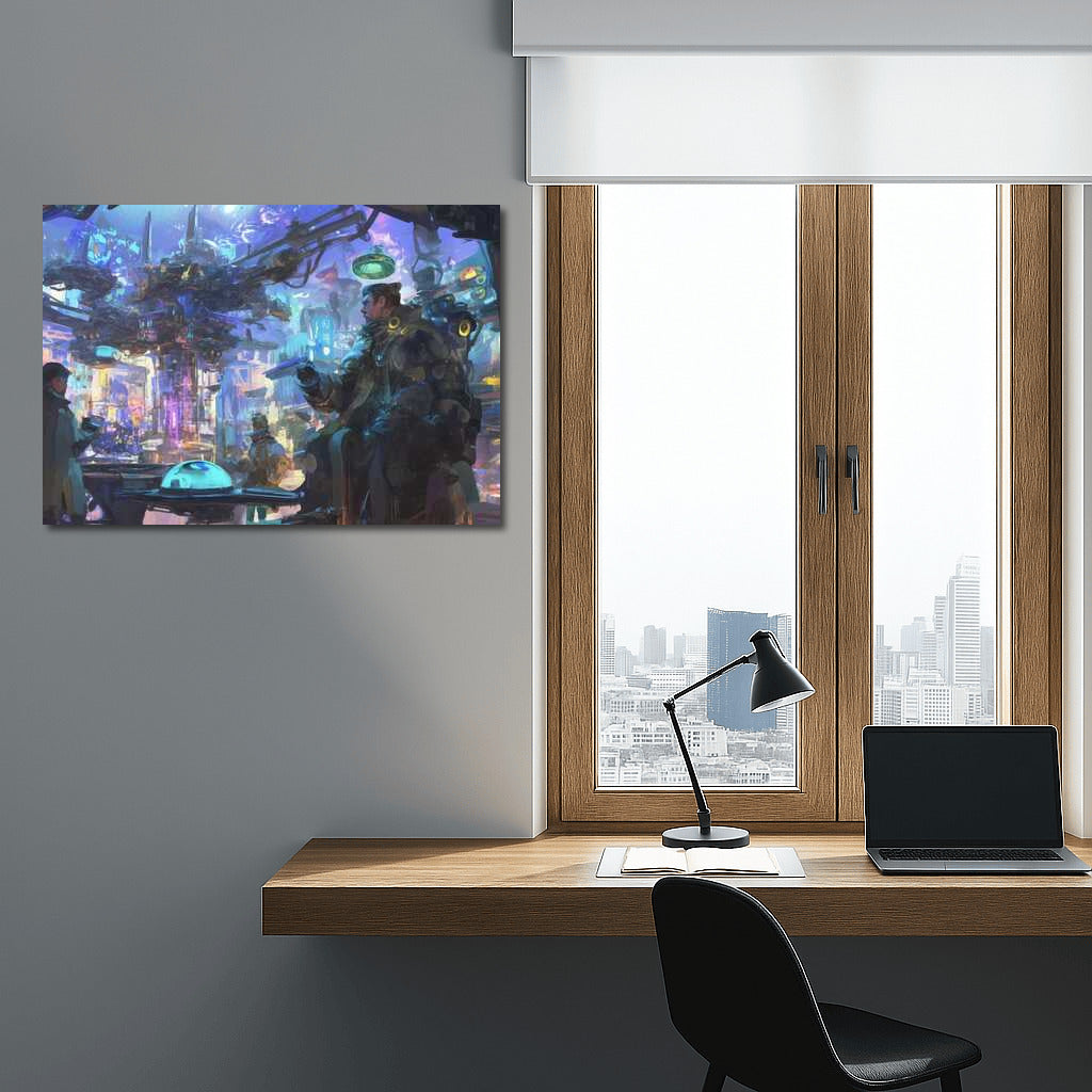 Open the door to the world of cryopunk: a fantastic poster with a city of the future, where reality meets a dream. Wall art. See more from the collection: Fantasy Art