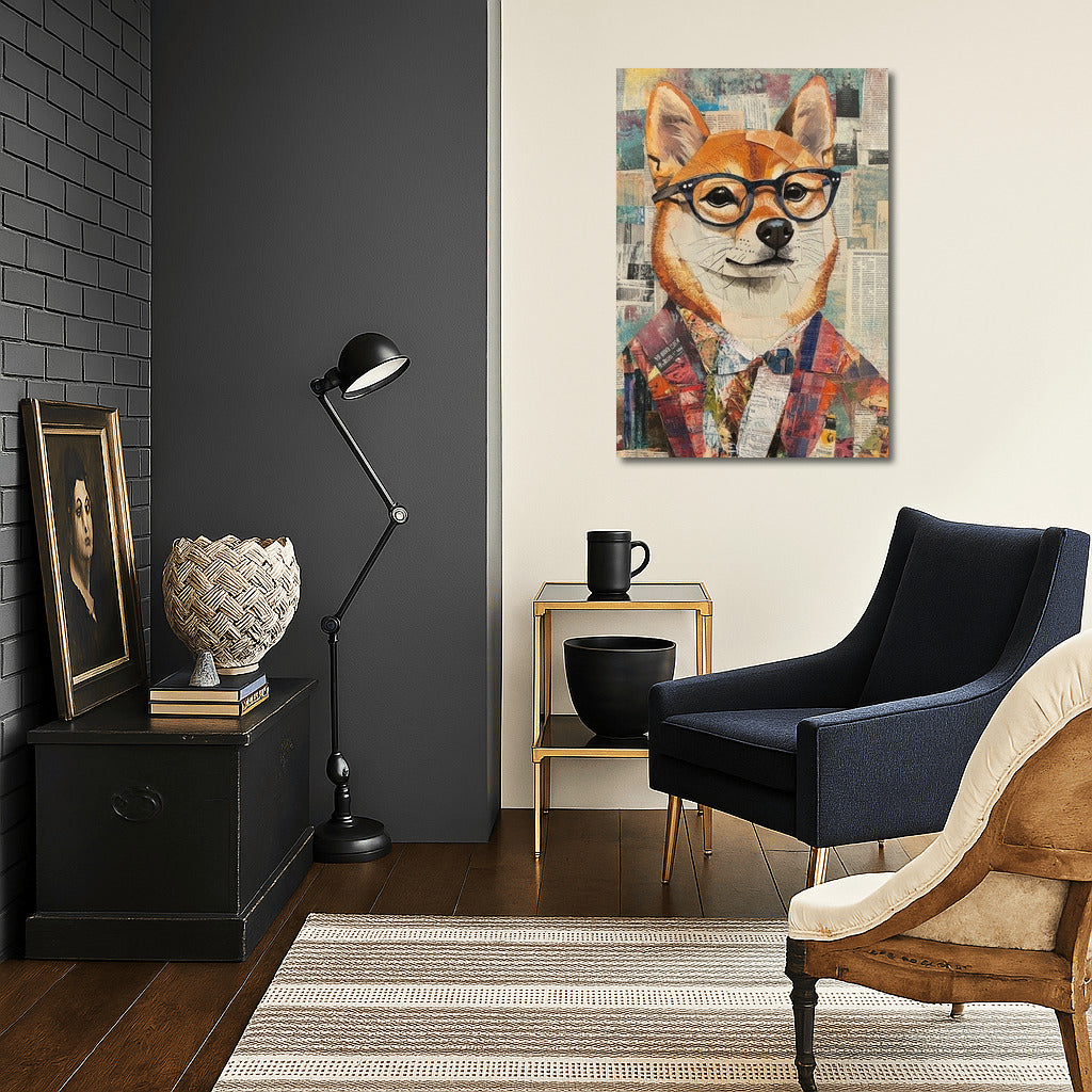Stylish poster: a smart dog in glasses and a suit. Ideal wall art for lovers of original paintings and creative decor! See more from the collection: Akita Art