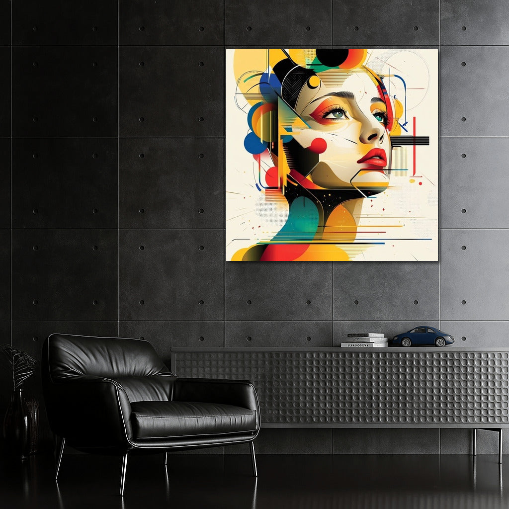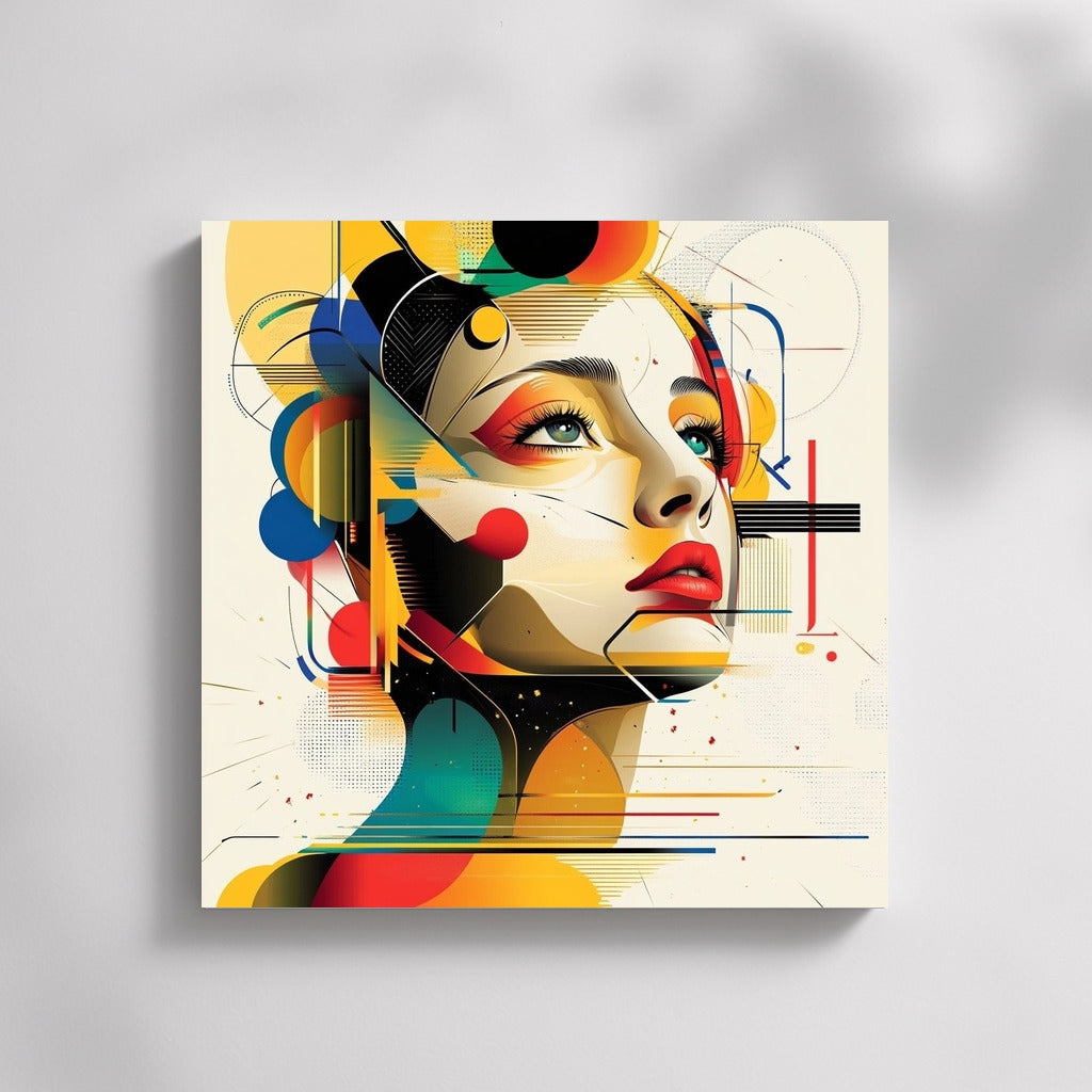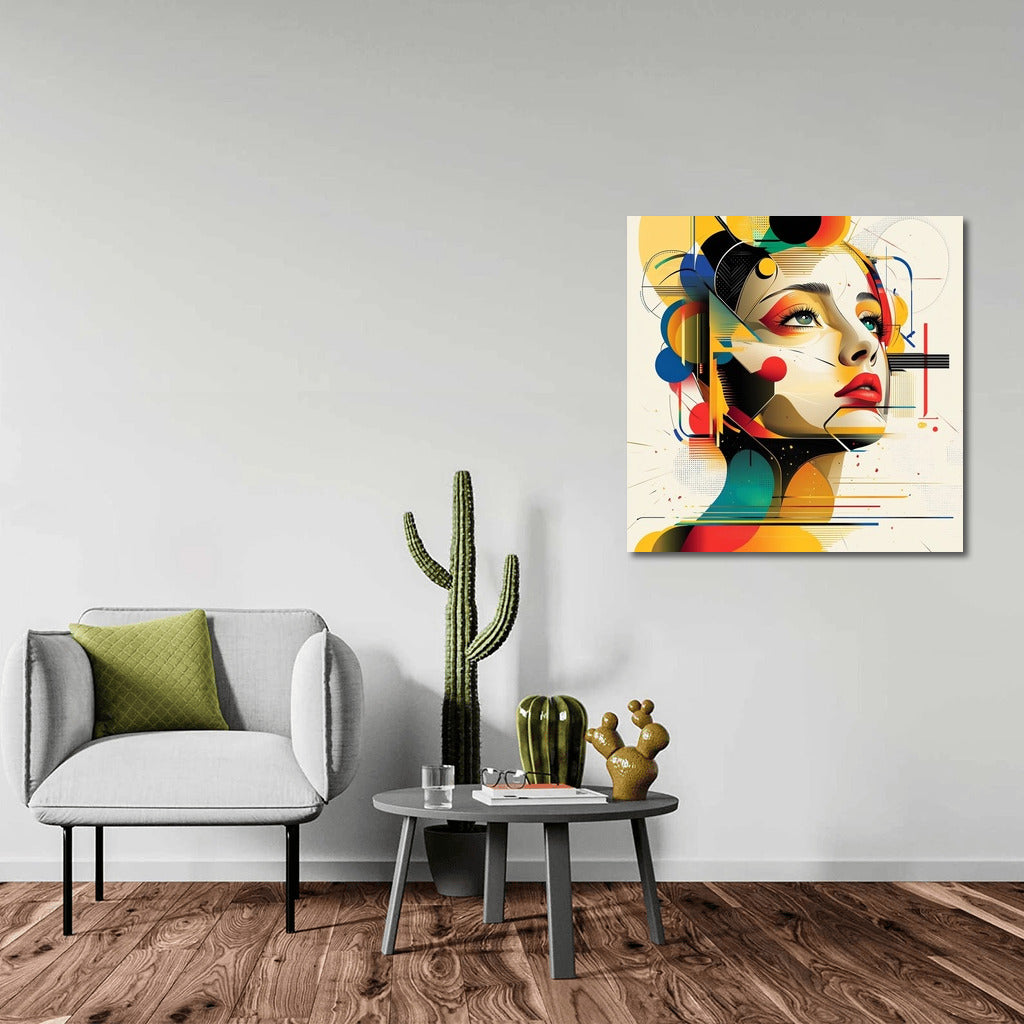 Abstract painting with vibrant geometric elements creating a unique wall art with a dreamy atmosphere. See more from the collection: Mixed Wall Art